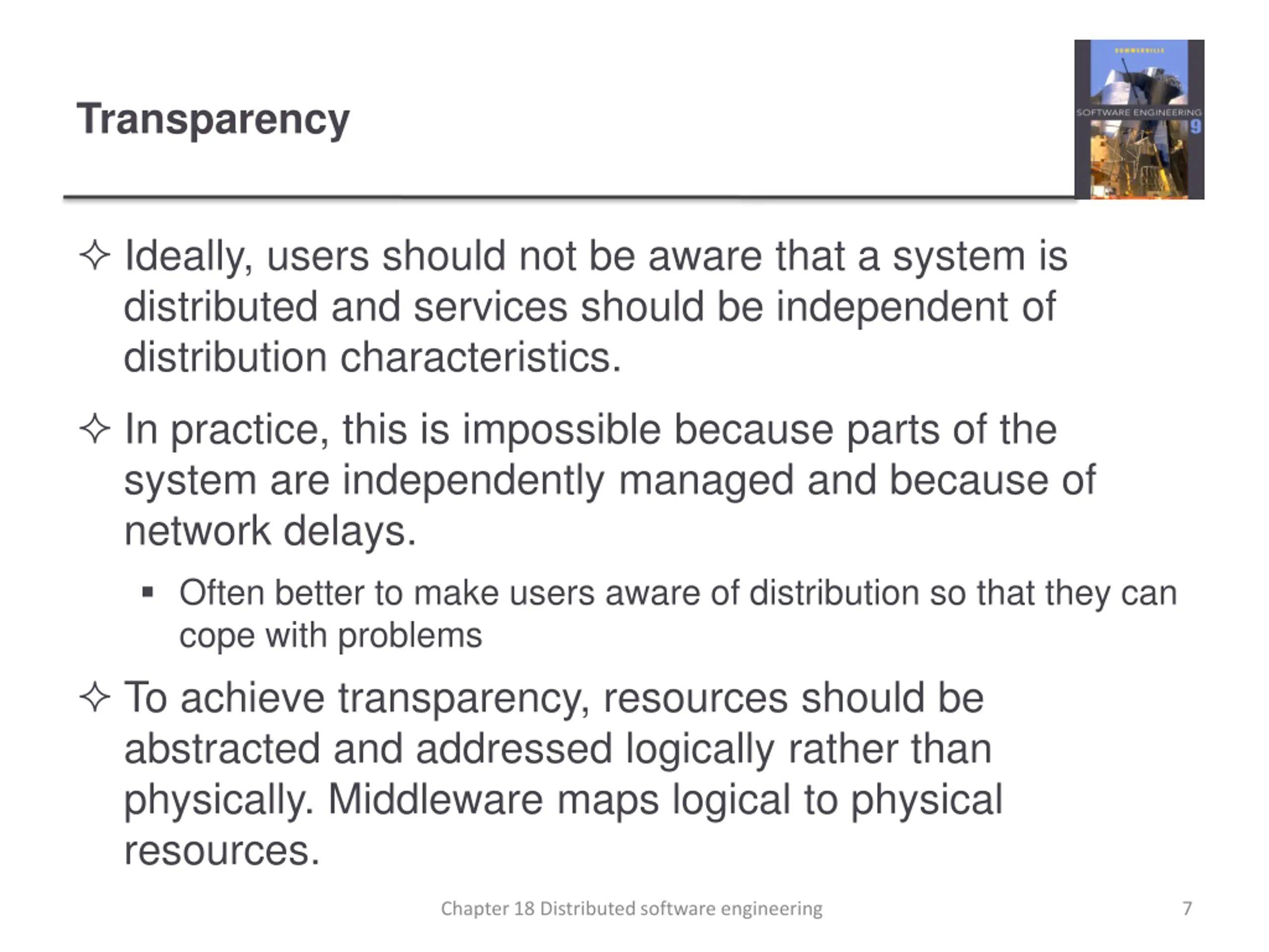 Transparency Ideally, users should not be aware that a system is distributed and services should be independent of distribution characteristics. In practice, this is impossible because parts of the system are independently managed and because of network delays. Often better to make users aware of distribution so that they can cope with problems To achieve transparency, resources should be abstracted and addressed logically rather than physically. Middleware maps logical to physical resources. Chapter 18 Distributed software engineering 7