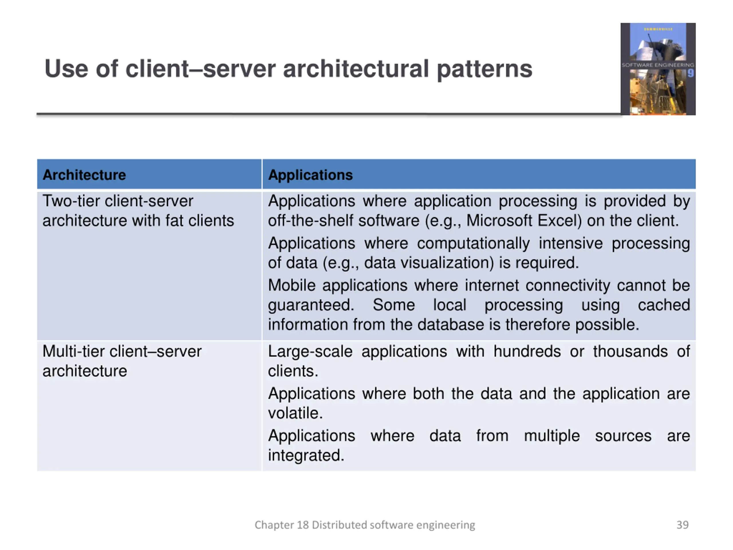 Use of clientserver architectural patterns Architecture Two-tier client-server architecture with fat clients Applications Applications where application processing is provided by off-the-shelf software (e.g., Microsoft Excel) on the client. Applications where computationally intensive processing of data (e.g., data visualization) is required. Mobile applications where internet connectivity cannot be guaranteed. Some local processing using cached information from the database is therefore possible. Large-scale applications with hundreds or thousands of clients. Applications where both the data and the application are volatile. Applications where data from multiple sources are integrated. Multi-tier client server architecture Chapter 18 Distributed software engineering 39
