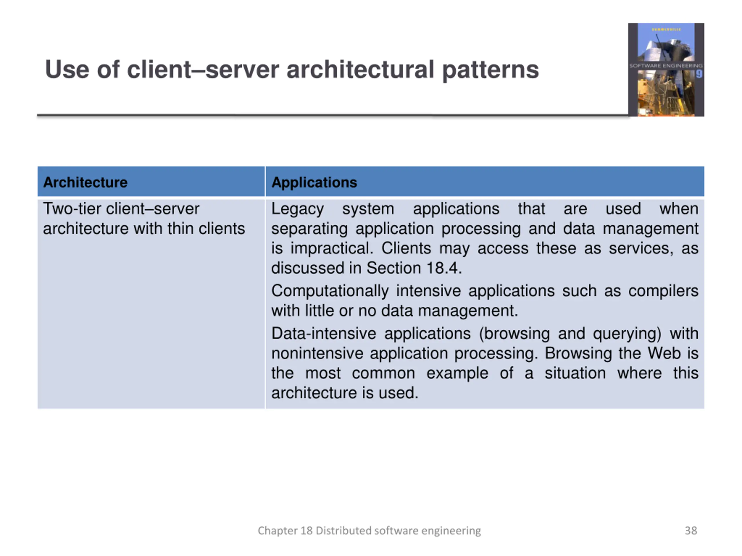 Use of clientserver architectural patterns Architecture Two-tier client server architecture with thin clients Applications Legacy system applications that are used when separating application processing and data management is impractical. Clients may access these as services, as discussed in Section 18.4. Computationally intensive applications such as compilers with little or no data management. Data-intensive applications (browsing and querying) with nonintensive application processing. Browsing the Web is the most common example of a situation where this architecture is used. Chapter 18 Distributed software engineering 38