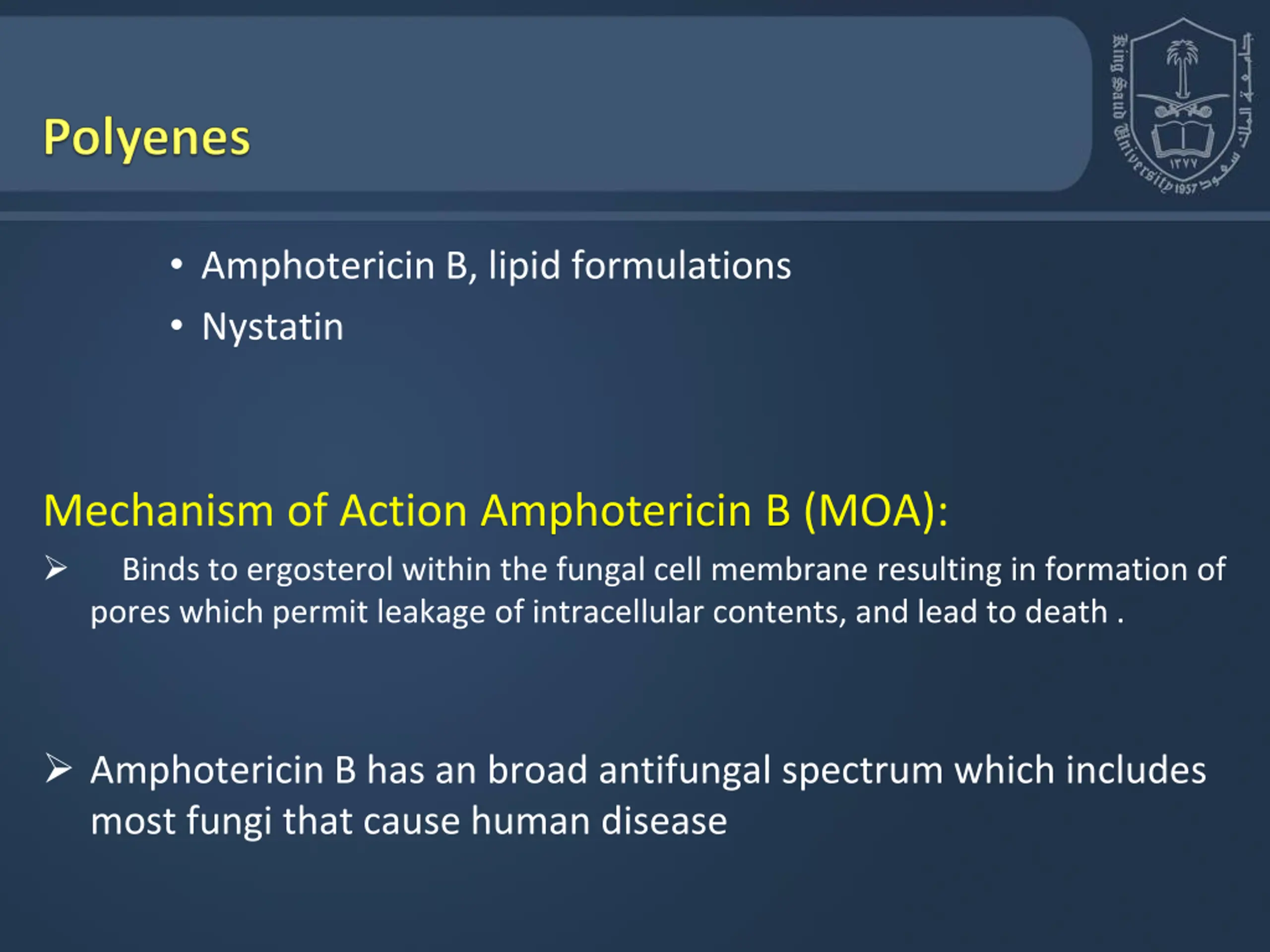 Amphotericin B, lipid formulations Nystatin Mechanism of Action Amphotericin B (MOA): Binds to ergosterol within the fungal cell membrane resulting in formation of pores which permit leakage of intracellular contents, and lead to death . Amphotericin B has an broad antifungal spectrum which includes most fungi that cause human disease