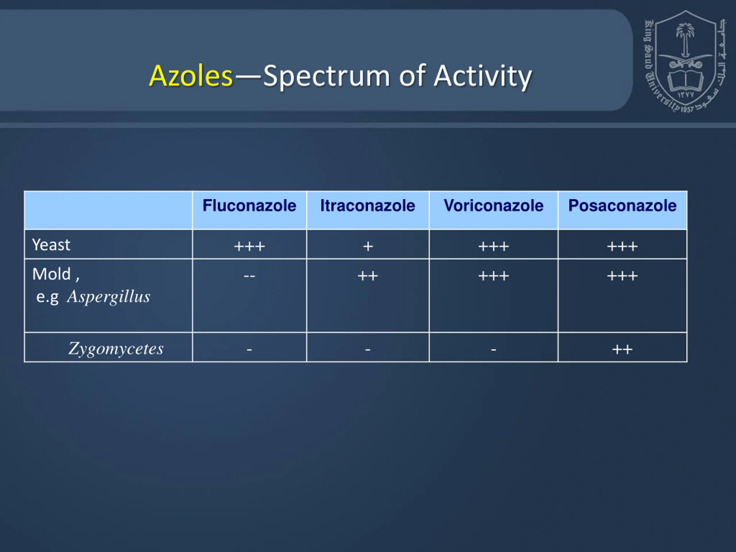 AzolesSpectrum of Activity Fluconazole Itraconazole Voriconazole Posaconazole +++ -- + +++ +++ +++ +++ Yeast ++ Mold , e.g Aspergillus - - - ++ Zygomycetes