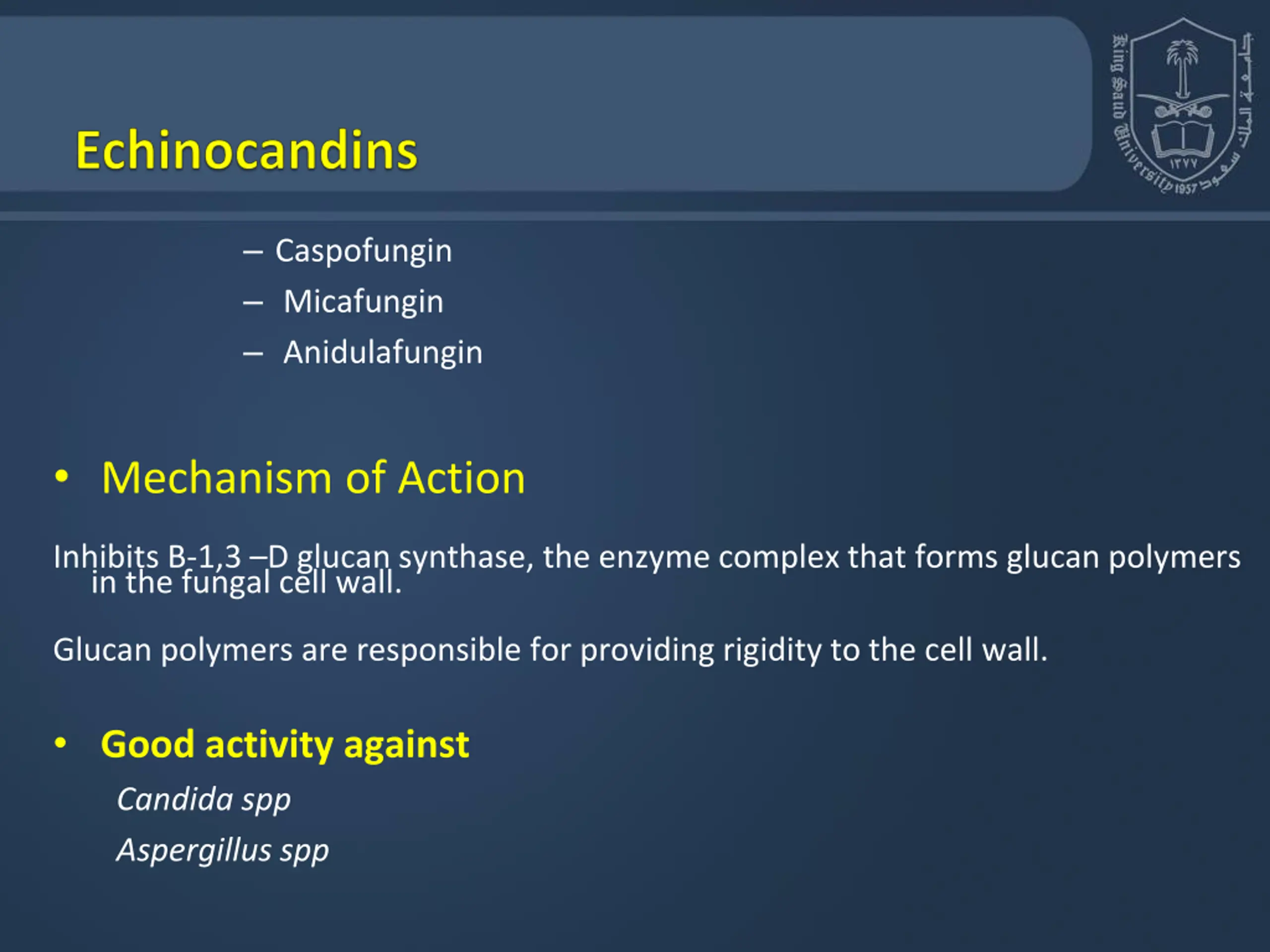 Caspofungin Micafungin Anidulafungin Mechanism of Action Inhibits B-1,3 D glucan synthase, the enzyme complex that forms glucan polymers in the fungal cell wall. Glucan polymers are responsible for providing rigidity to the cell wall. Good activity against Candida spp Aspergillus spp