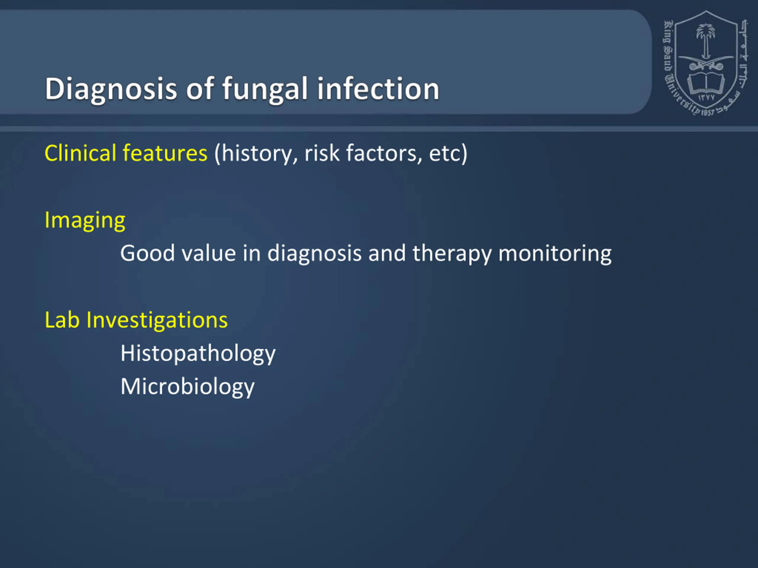 Clinical features (history, risk factors, etc) Imaging Good value in diagnosis and therapy monitoring Lab Investigations Histopathology Microbiology