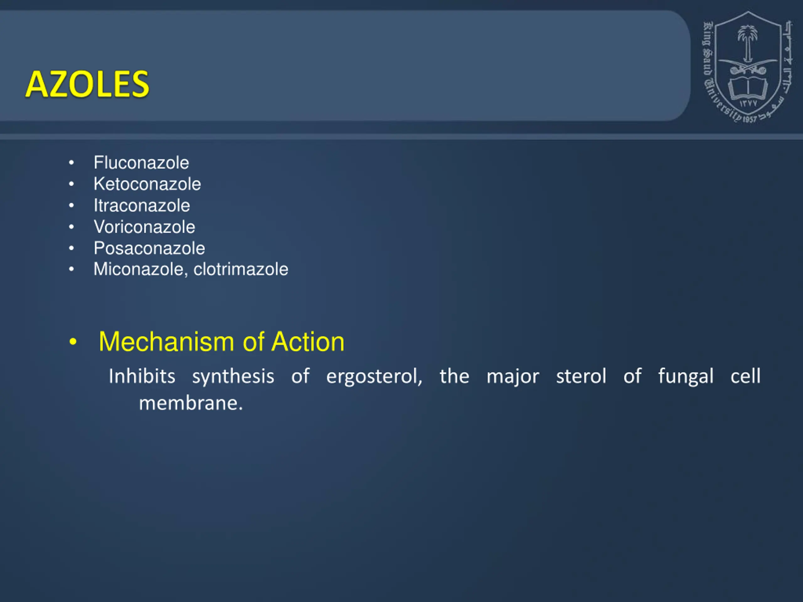 Fluconazole Ketoconazole Itraconazole Voriconazole Posaconazole Miconazole, clotrimazole Mechanism of Action Inhibits synthesis of ergosterol, the major sterol of fungal cell membrane.