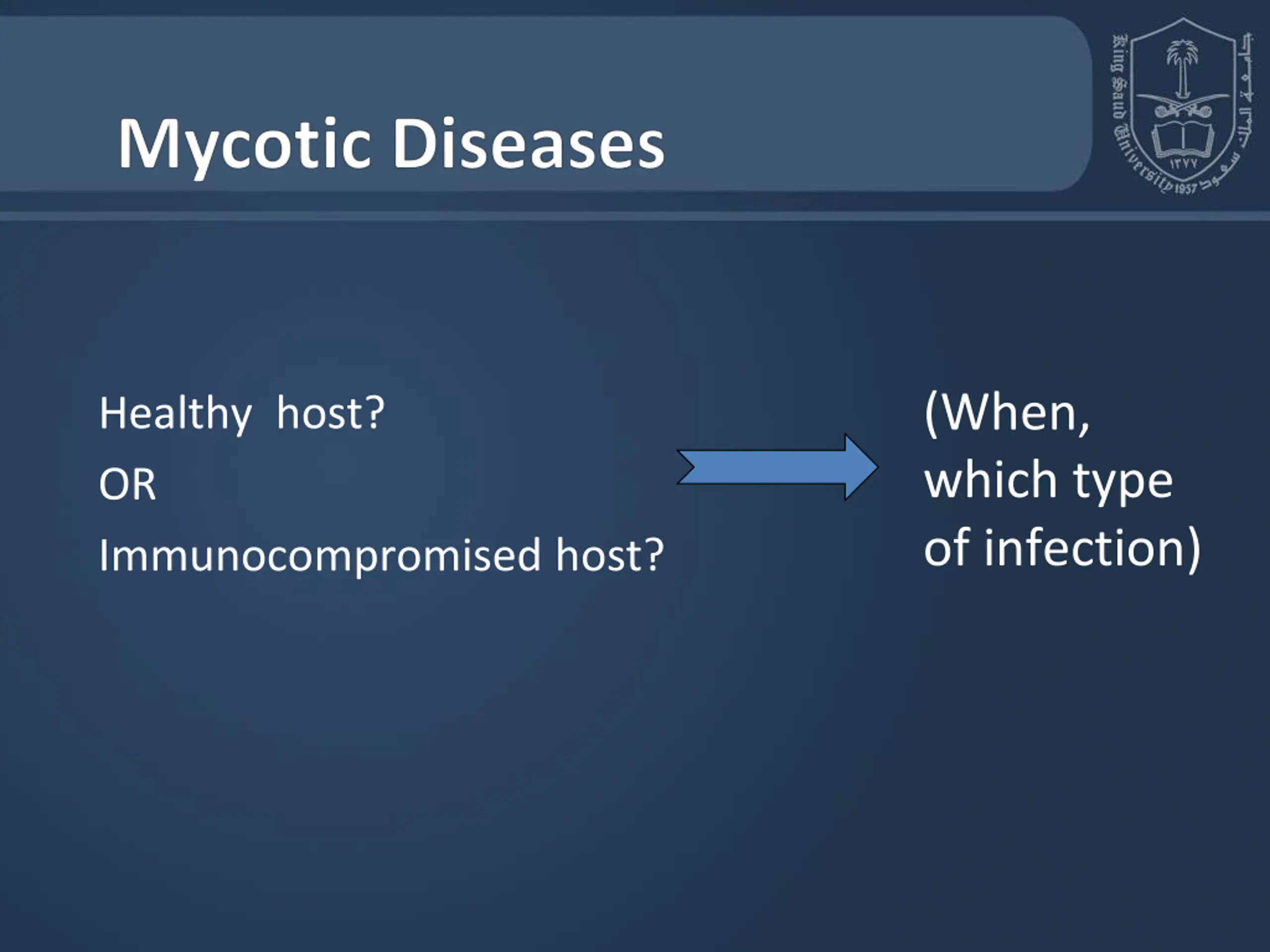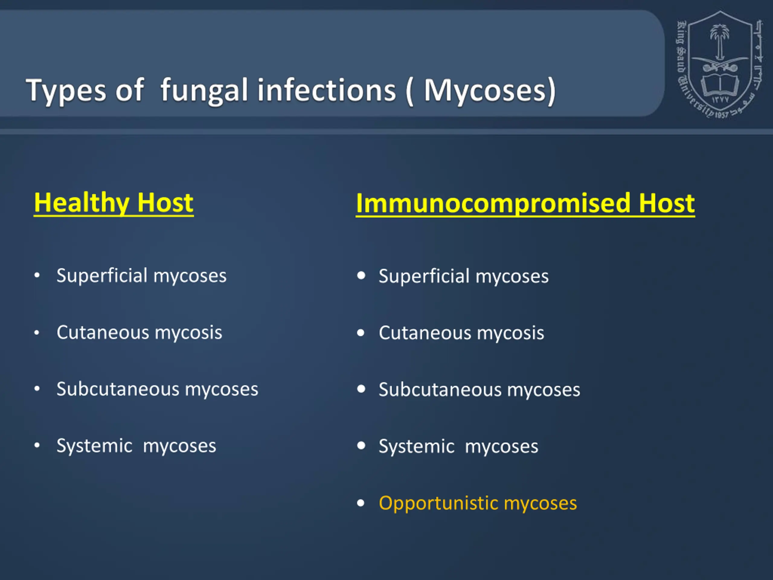 Healthy Host Immunocompromised Host Superficial mycoses Superficial mycoses Cutaneous mycosis Cutaneous mycosis Subcutaneous mycoses Subcutaneous mycoses Systemic mycoses Systemic mycoses Opportunistic mycoses