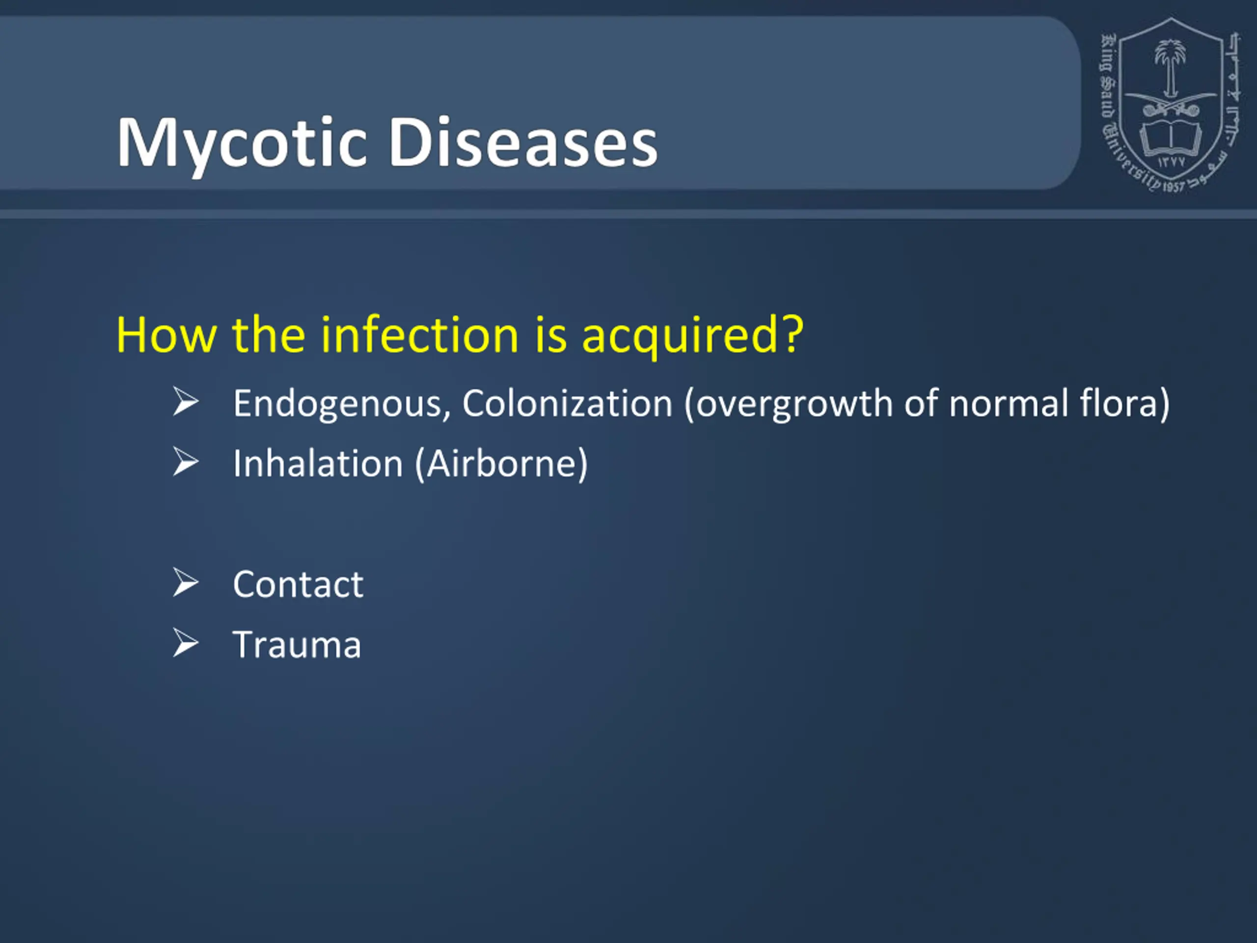 How the infection is acquired? Endogenous, Colonization (overgrowth of normal flora) Inhalation (Airborne) Contact Trauma