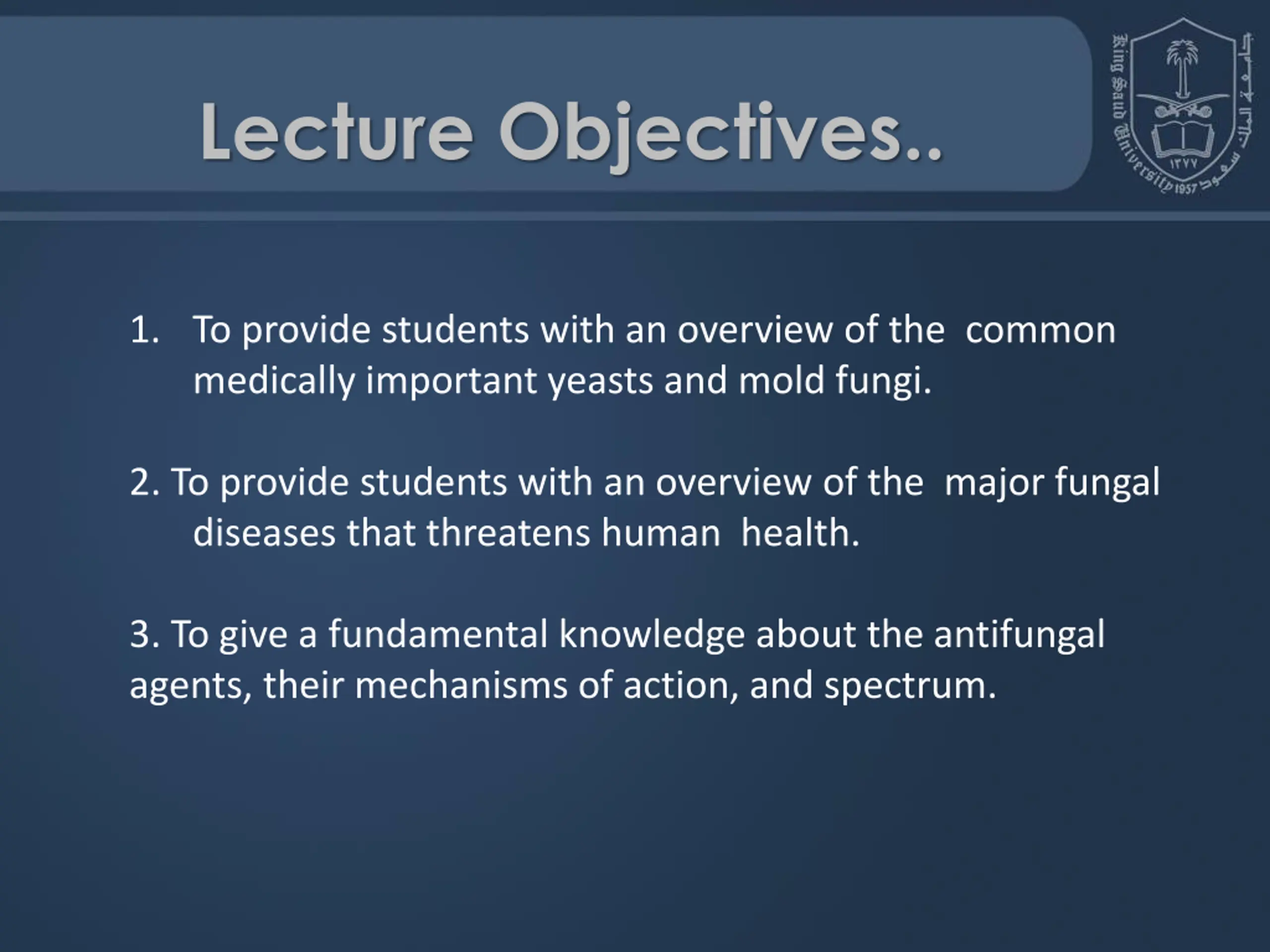 Lecture Objectives.. 1. To provide students with an overview of the common medically important yeasts and mold fungi. 2. To provide students with an overview of the major fungal diseases that threatens human health. 3. To give a fundamental knowledge about the antifungal agents, their mechanisms of action, and spectrum.