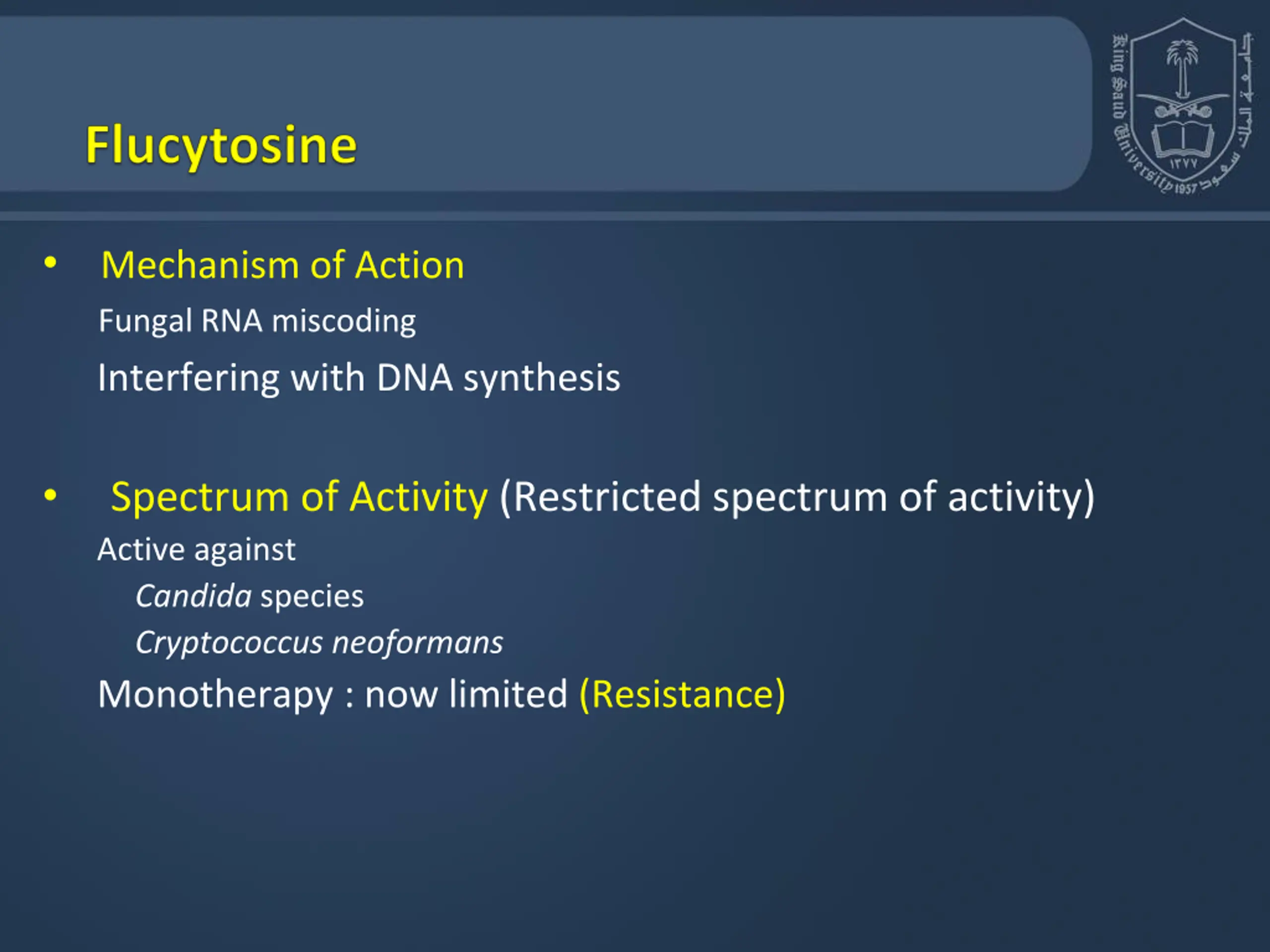 Mechanism of Action Fungal RNA miscoding Interfering with DNA synthesis Spectrum of Activity (Restricted spectrum of activity) Active against Candida species Cryptococcus neoformans Monotherapy : now limited (Resistance)