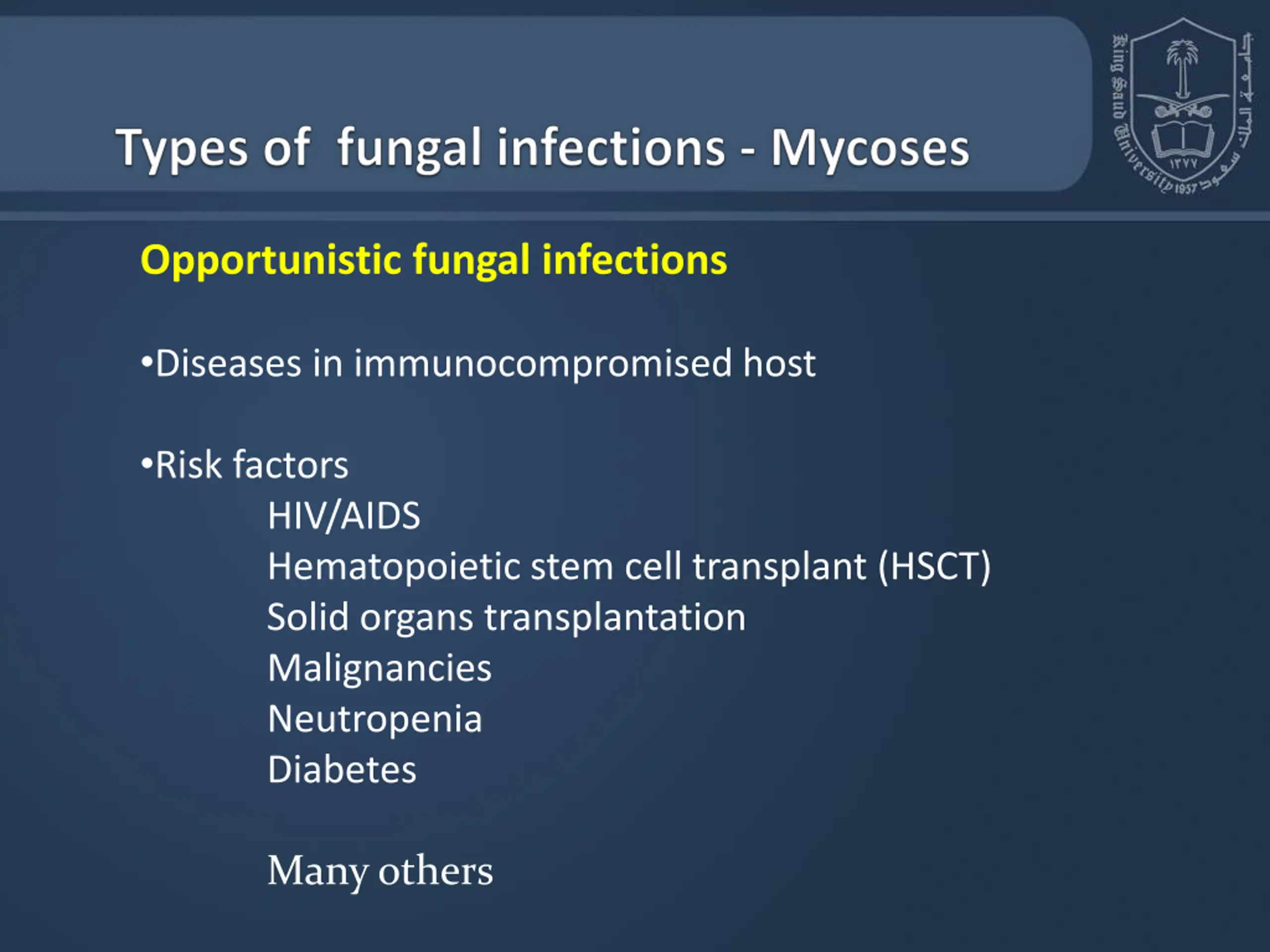 Opportunistic fungal infections Diseases in immunocompromised host Risk factors HIV/AIDS Hematopoietic stem cell transplant (HSCT) Solid organs transplantation Malignancies Neutropenia Diabetes Many others