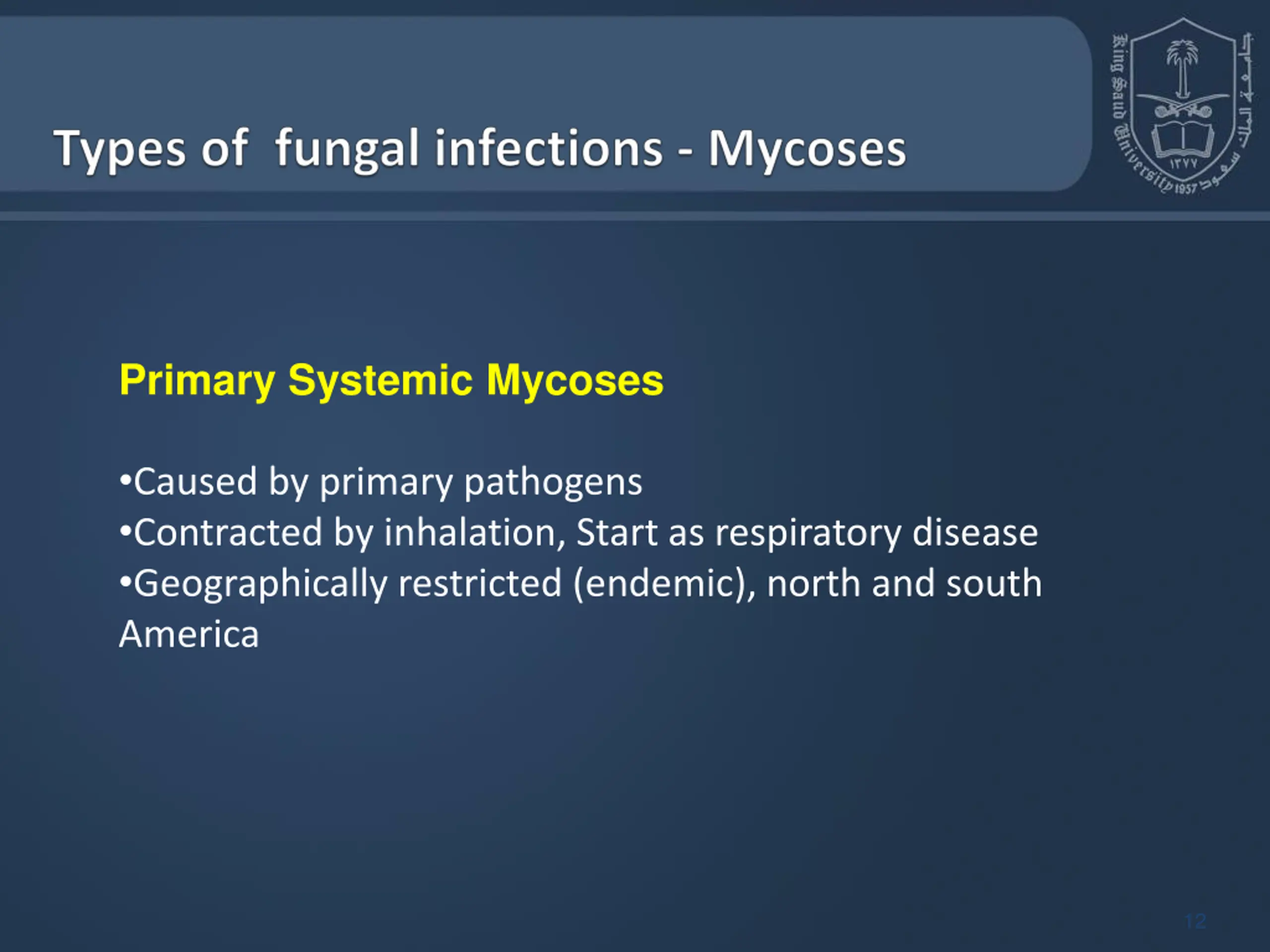 Primary Systemic Mycoses Caused by primary pathogens Contracted by inhalation, Start as respiratory disease Geographically restricted (endemic), north and south America 12