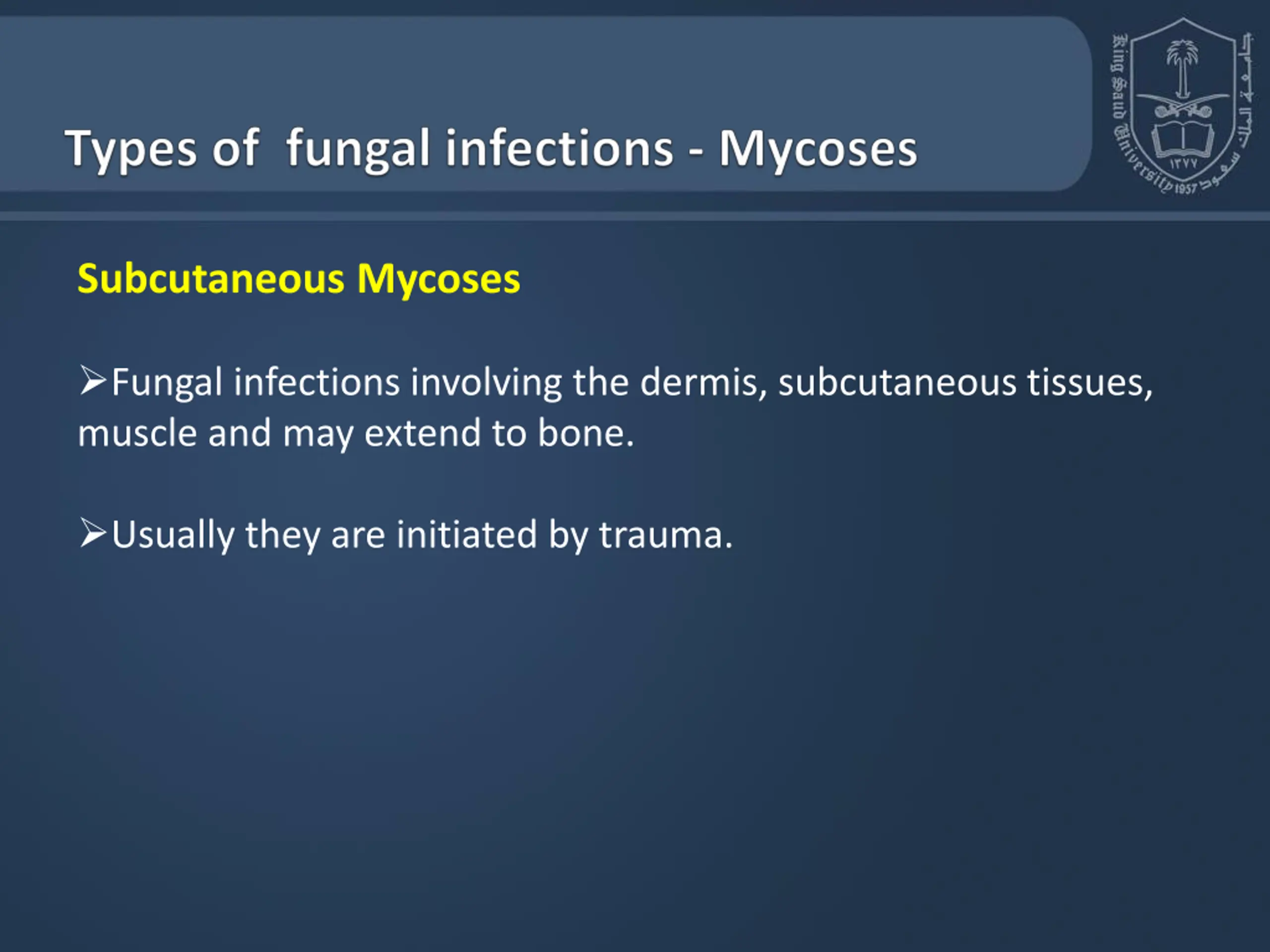 Subcutaneous Mycoses Fungal infections involving the dermis, subcutaneous tissues, muscle and may extend to bone. Usually they are initiated by trauma.