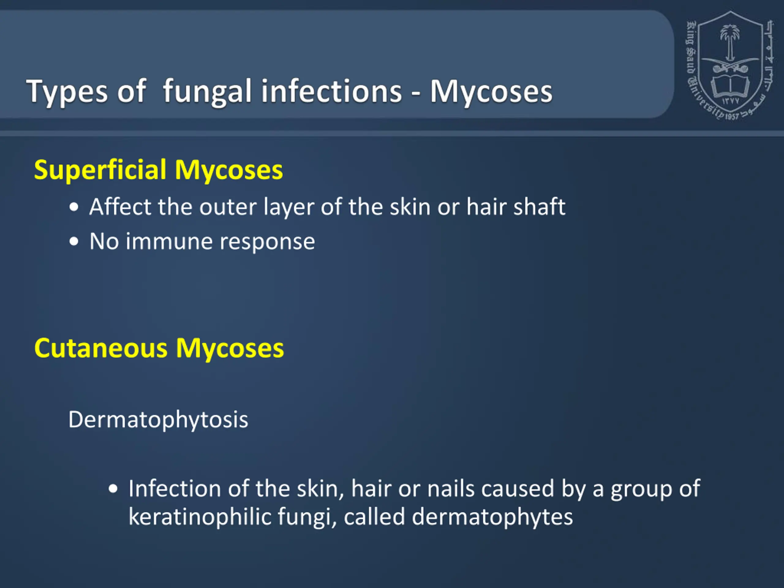 Superficial Mycoses Affect the outer layer of the skin or hair shaft No immune response Cutaneous Mycoses Dermatophytosis Infection of the skin, hair or nails caused by a group of keratinophilic fungi, called dermatophytes