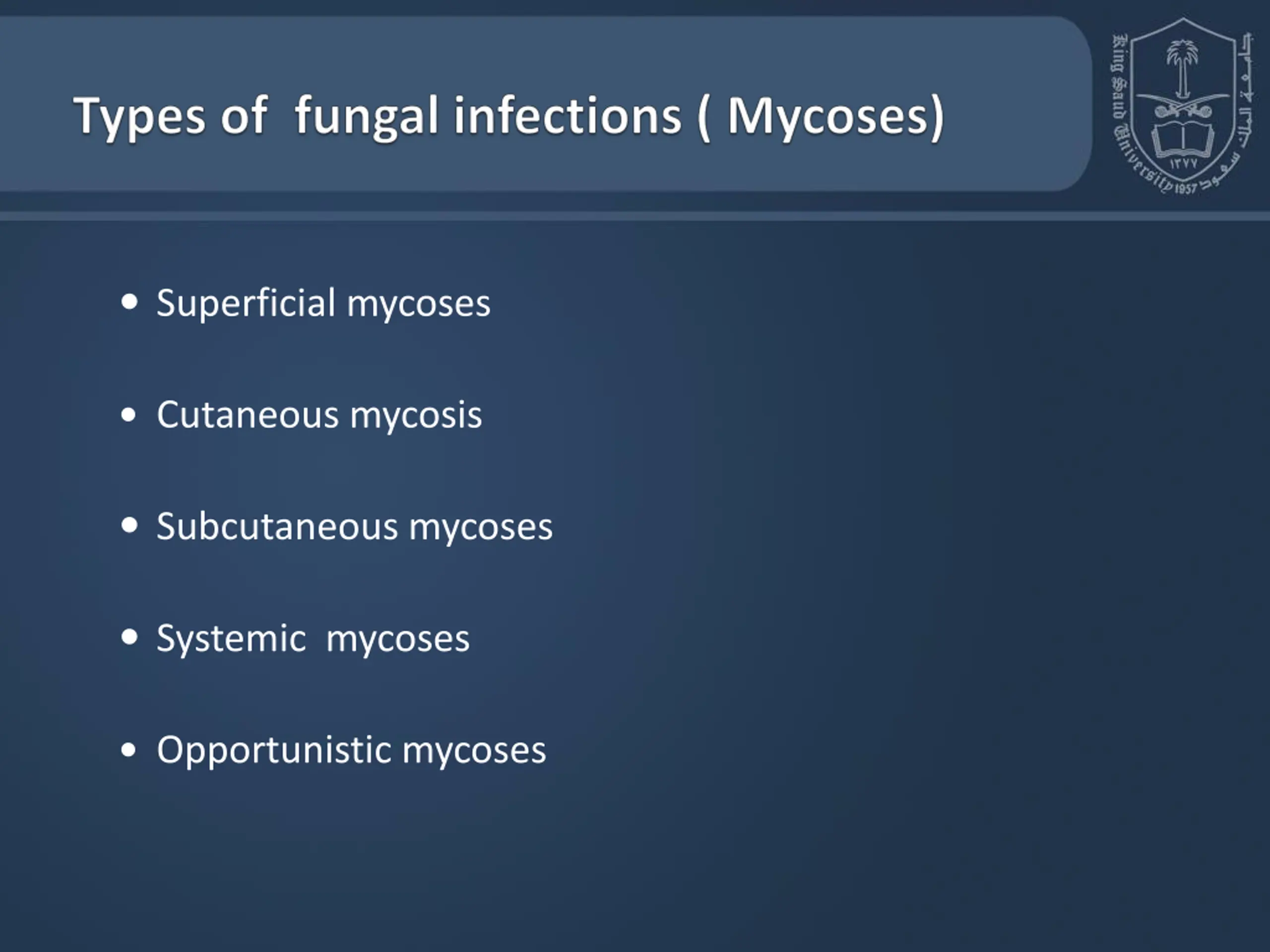 Superficial mycoses Cutaneous mycosis Subcutaneous mycoses Systemic mycoses Opportunistic mycoses