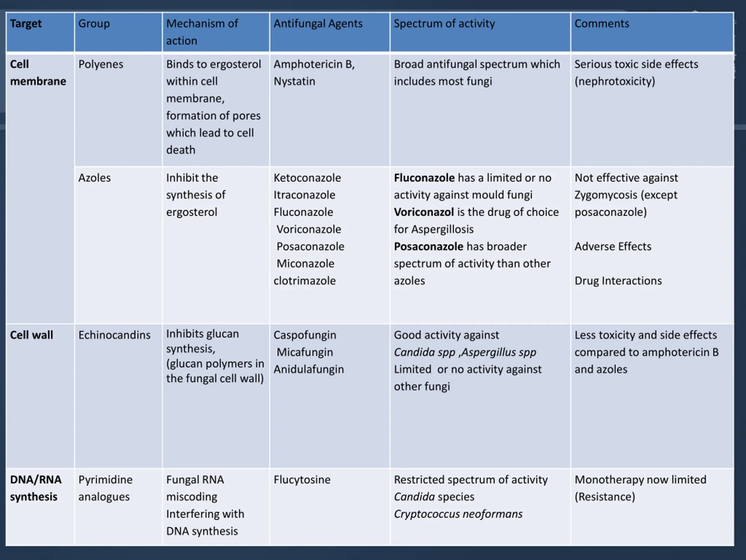 Target Group Mechanism of action Antifungal Agents Spectrum of activity Comments Cell membrane Polyenes Binds to ergosterol within cell membrane, formation of pores which lead to cell death Amphotericin B, Nystatin Broad antifungal spectrum which includes most fungi Serious toxic side effects (nephrotoxicity) Azoles Inhibit the synthesis of ergosterol Ketoconazole Itraconazole Fluconazole Voriconazole Posaconazole Miconazole clotrimazole Fluconazole has a limited or no activity against mould fungi Voriconazol is the drug of choice for Aspergillosis Posaconazole has broader spectrum of activity than other azoles Not effective against Zygomycosis (except posaconazole) Adverse Effects Drug Interactions Inhibits glucan synthesis, (glucan polymers in the fungal cell wall) Cell wall Echinocandins Caspofungin Micafungin Anidulafungin Good activity against Candida spp ,Aspergillus spp Limited or no activity against other fungi Less toxicity and side effects compared to amphotericin B and azoles DNA/RNA synthesis Pyrimidine analogues Fungal RNA miscoding Interfering with DNA synthesis Flucytosine Restricted spectrum of activity Candida species Cryptococcus neoformans Monotherapy now limited (Resistance)