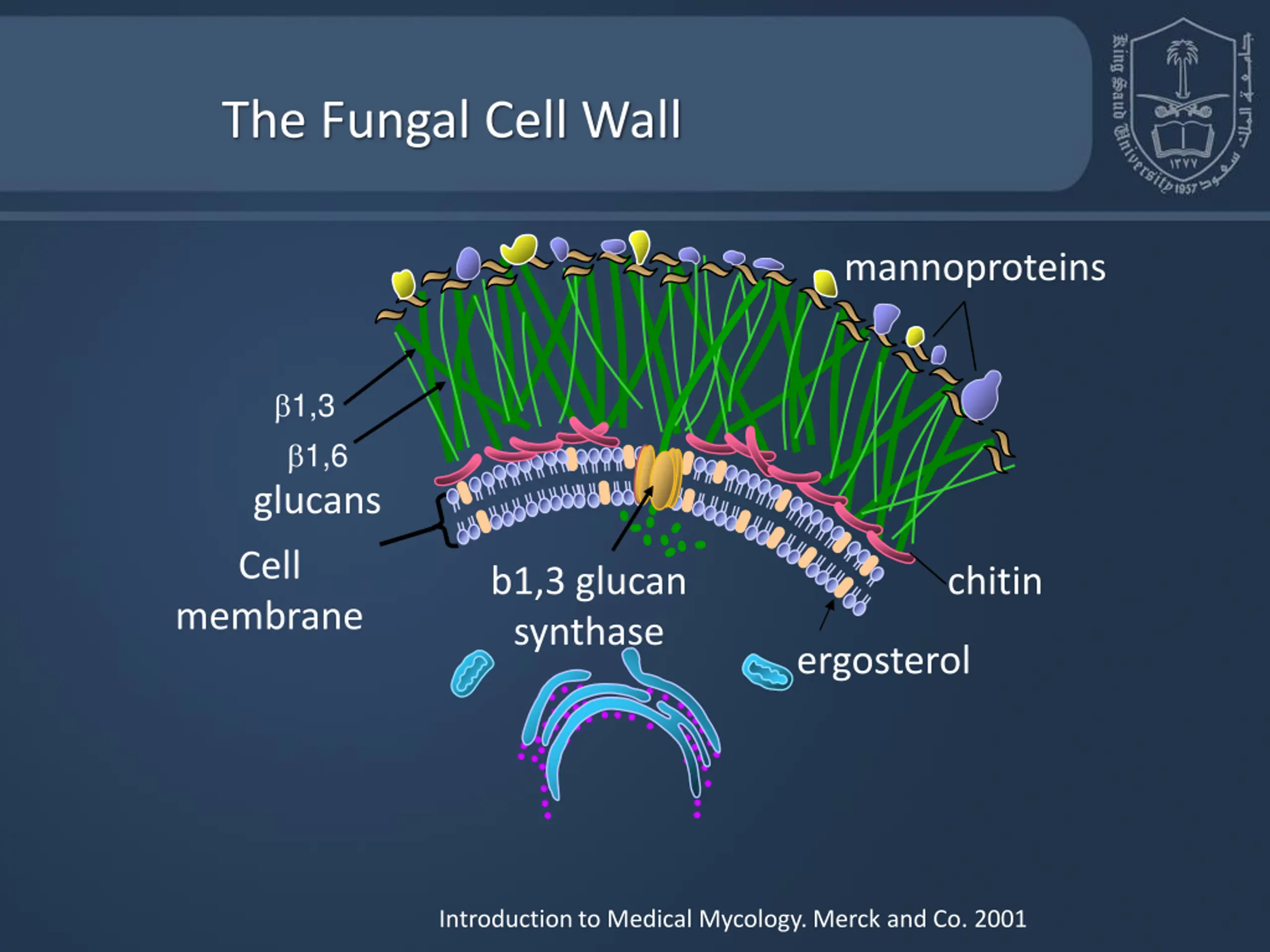 The Fungal Cell Wall mannoproteins 1,3 1,6 glucans Cell b1,3 glucan synthase chitin membrane ergosterol Introduction to Medical Mycology. Merck and Co. 2001