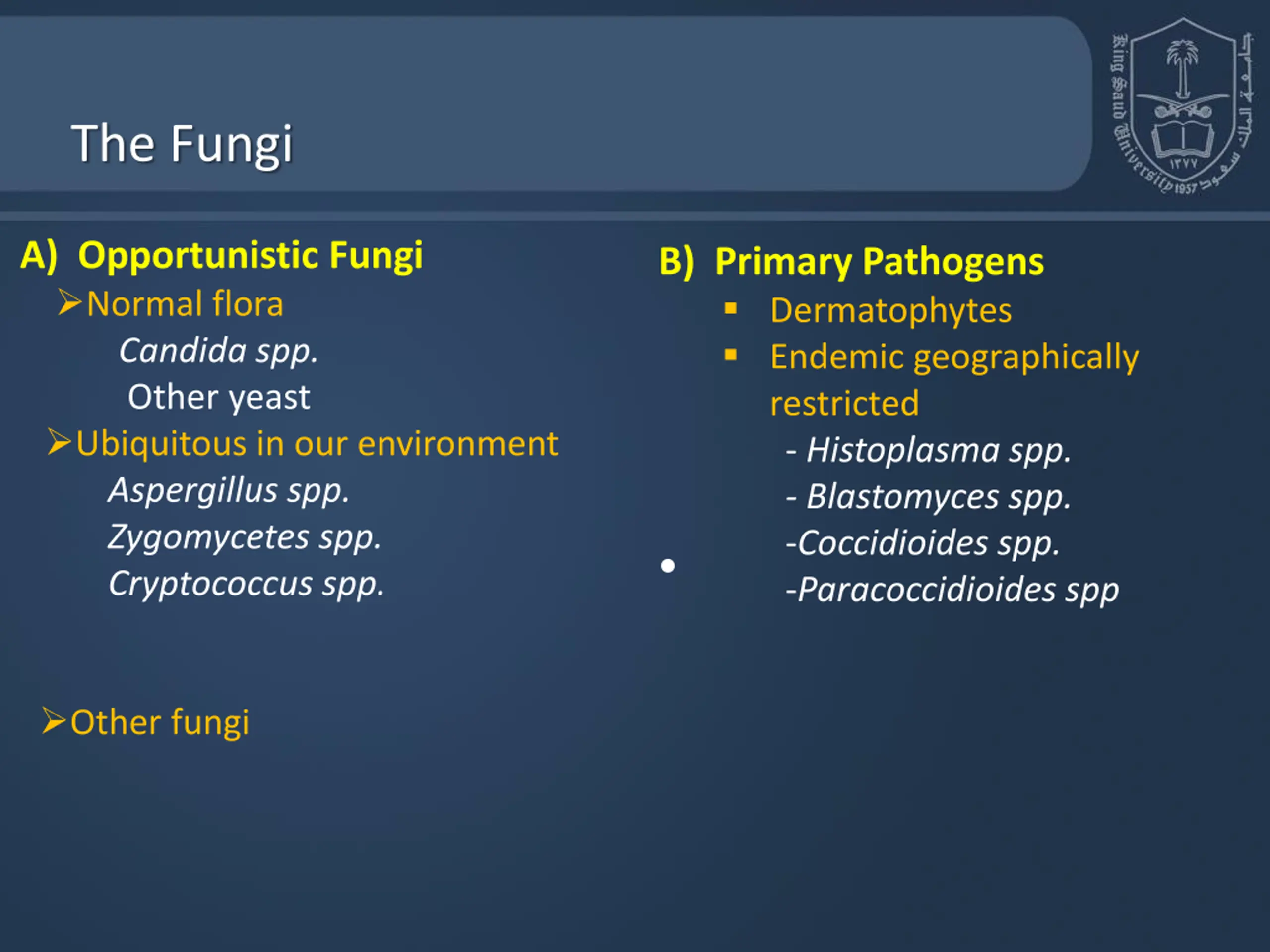 The Fungi A) Opportunistic Fungi Normal flora Candida spp. Other yeast Ubiquitous in our environment Aspergillus spp. Zygomycetes spp. Cryptococcus spp. B) Primary Pathogens Dermatophytes Endemic geographically restricted - Histoplasma spp. - Blastomyces spp. -Coccidioides spp. -Paracoccidioides spp Other fungi
