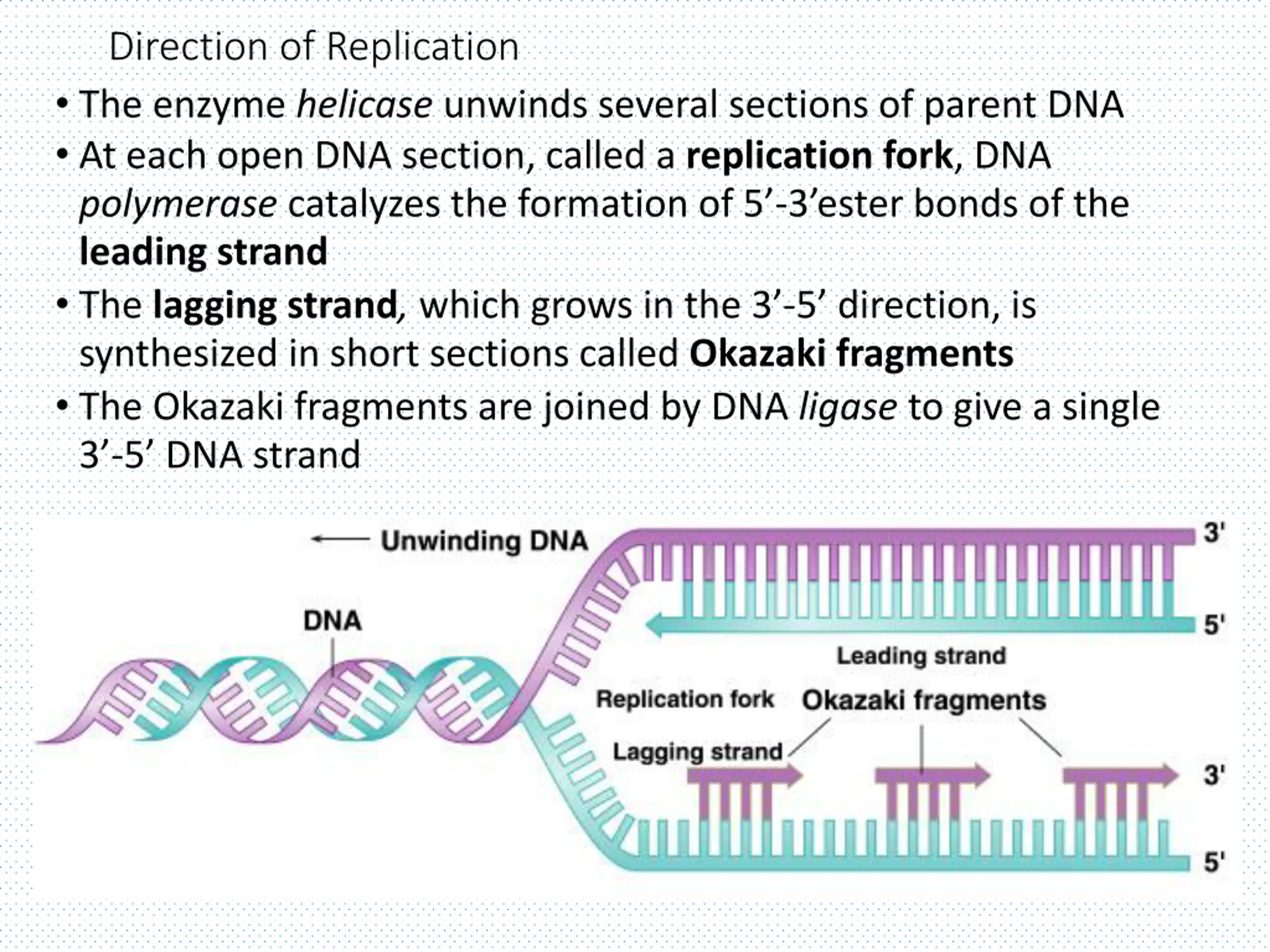 Direction of Replication The enzyme helicase unwinds several sections of parent DNA At each open DNA section, called a replication fork, DNA polymerasecatalyzes the formation of 5 -3 ester bonds of the leading strand The lagging strand, which grows in the 3 -5 direction, is synthesized in short sections called Okazaki fragments The Okazaki fragments are joined by DNA ligase to give a single 3 -5 DNA strand