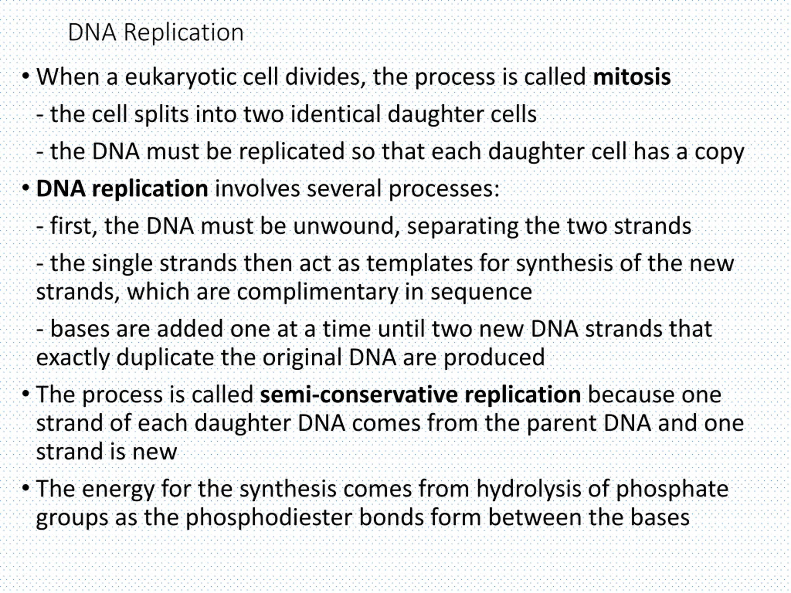 DNA Replication When a eukaryotic cell divides, the process is called mitosis - the cell splits into two identical daughter cells - the DNA must be replicated so that each daughter cell has a copy DNA replication involves several processes: - first, the DNA must be unwound, separating the two strands - the single strands then act as templates for synthesis of the new strands, which are complimentary in sequence - bases are added one at a time until two new DNA strands that exactly duplicate the original DNA are produced The process is called semi-conservative replication because one strand of each daughter DNA comes from the parent DNA and one strand is new The energy for the synthesis comes from hydrolysis of phosphate groups as the phosphodiester bonds form between the bases