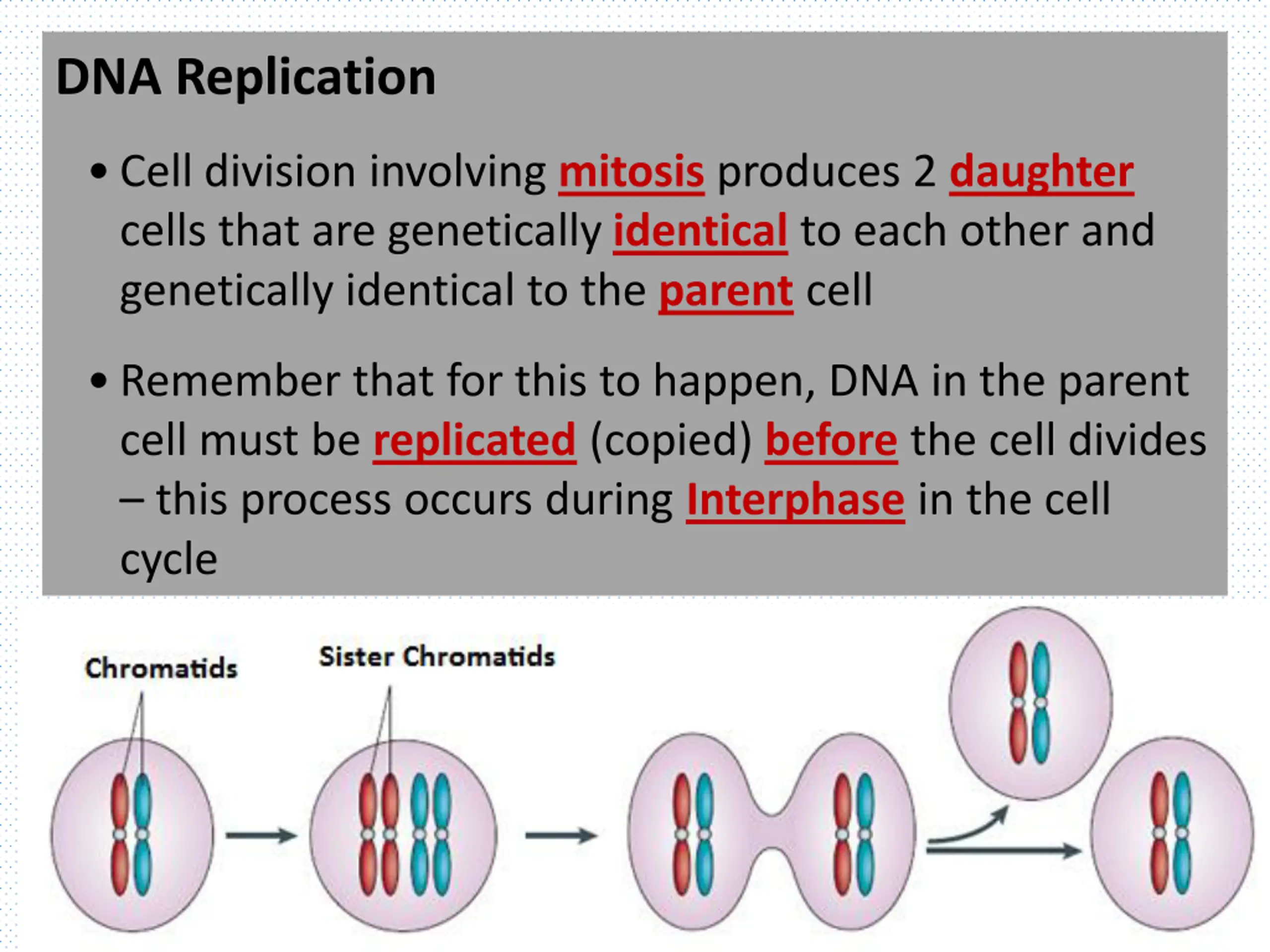 DNA Replication Cell division involving mitosis produces 2 daughter cells that are genetically identical to each other and genetically identical to the parent cell Remember that for this to happen, DNA in the parent cell must be replicated (copied) before the cell divides this process occurs during Interphase in the cell cycle