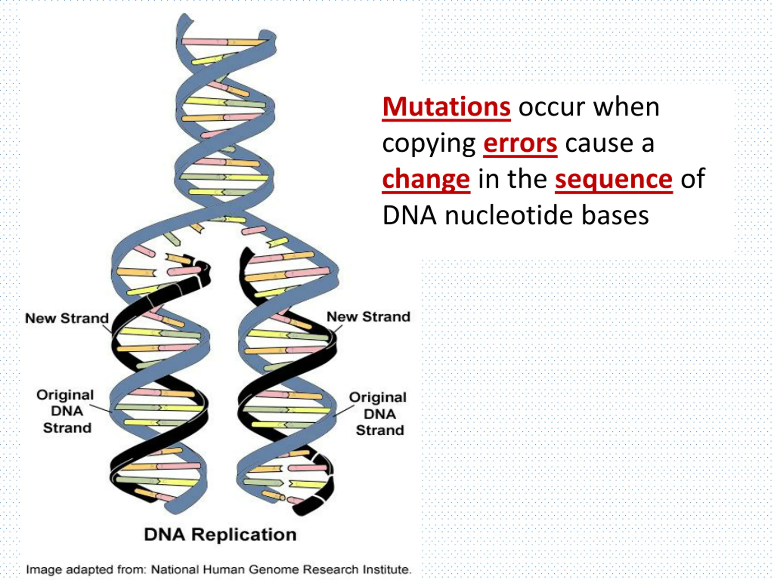 Mutations occur when copying errors cause a change in the sequence of DNA nucleotide bases