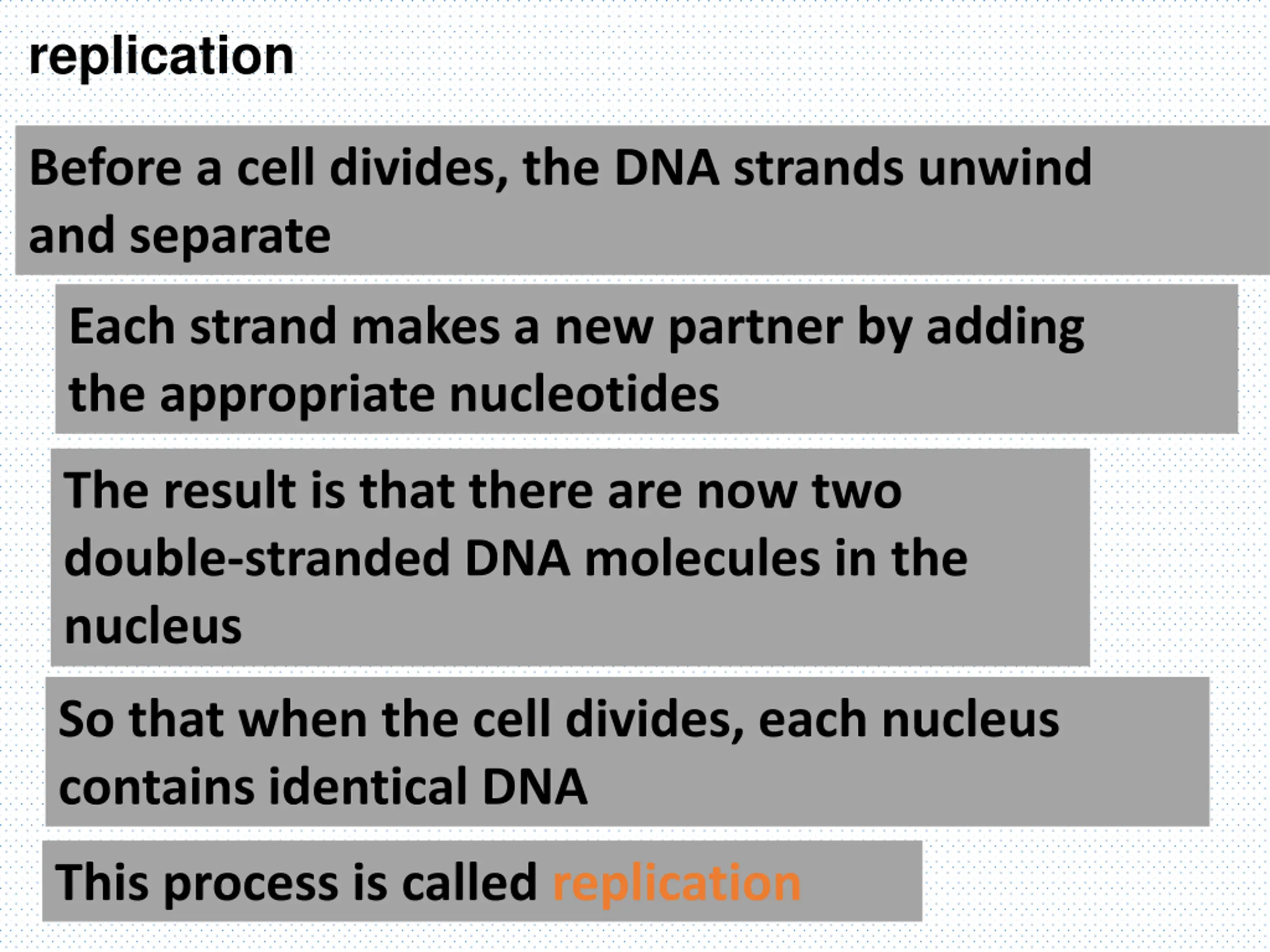replication Before a cell divides, the DNA strands unwind and separate Each strand makes a new partner by adding the appropriate nucleotides The result is that there are now two double-stranded DNA molecules in the nucleus So that when the cell divides, each nucleus contains identical DNA This process is called replication