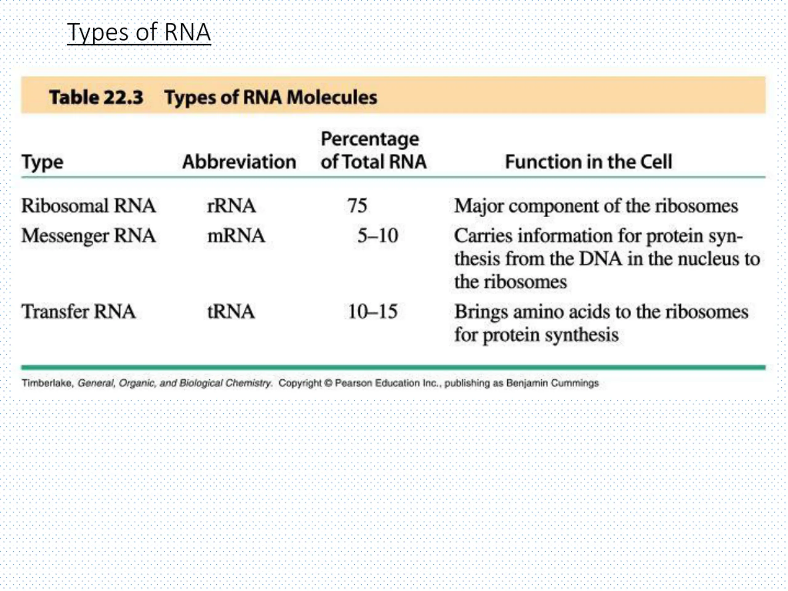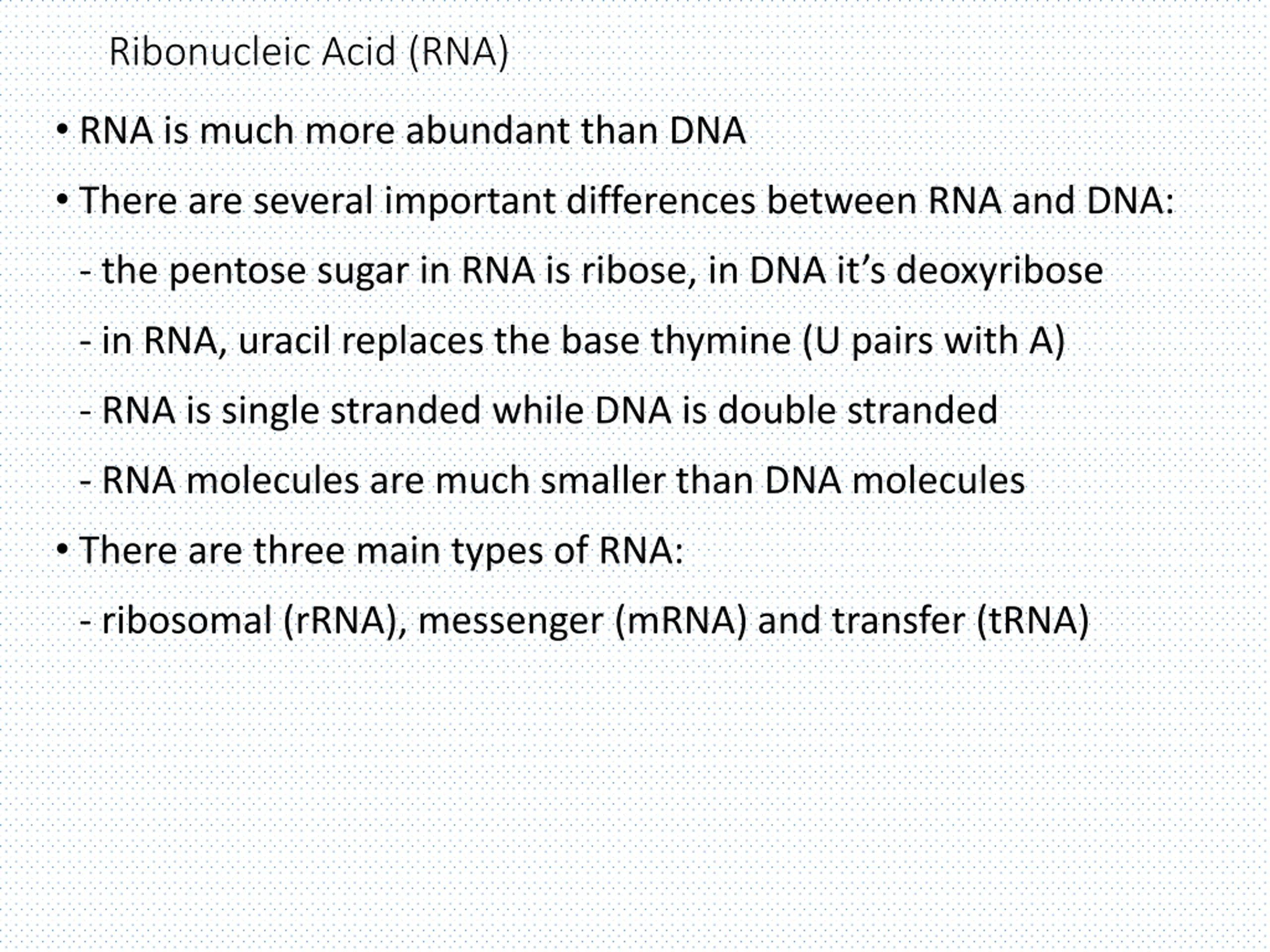 Ribonucleic Acid (RNA) RNA is much more abundant than DNA There are several important differences between RNA and DNA: - the pentose sugar in RNA is ribose, in DNA it s deoxyribose - in RNA, uracil replaces the base thymine (U pairs with A) - RNA is single stranded while DNA is double stranded - RNA molecules are much smaller than DNA molecules There are three main types of RNA: - ribosomal (rRNA), messenger (mRNA) and transfer (tRNA)