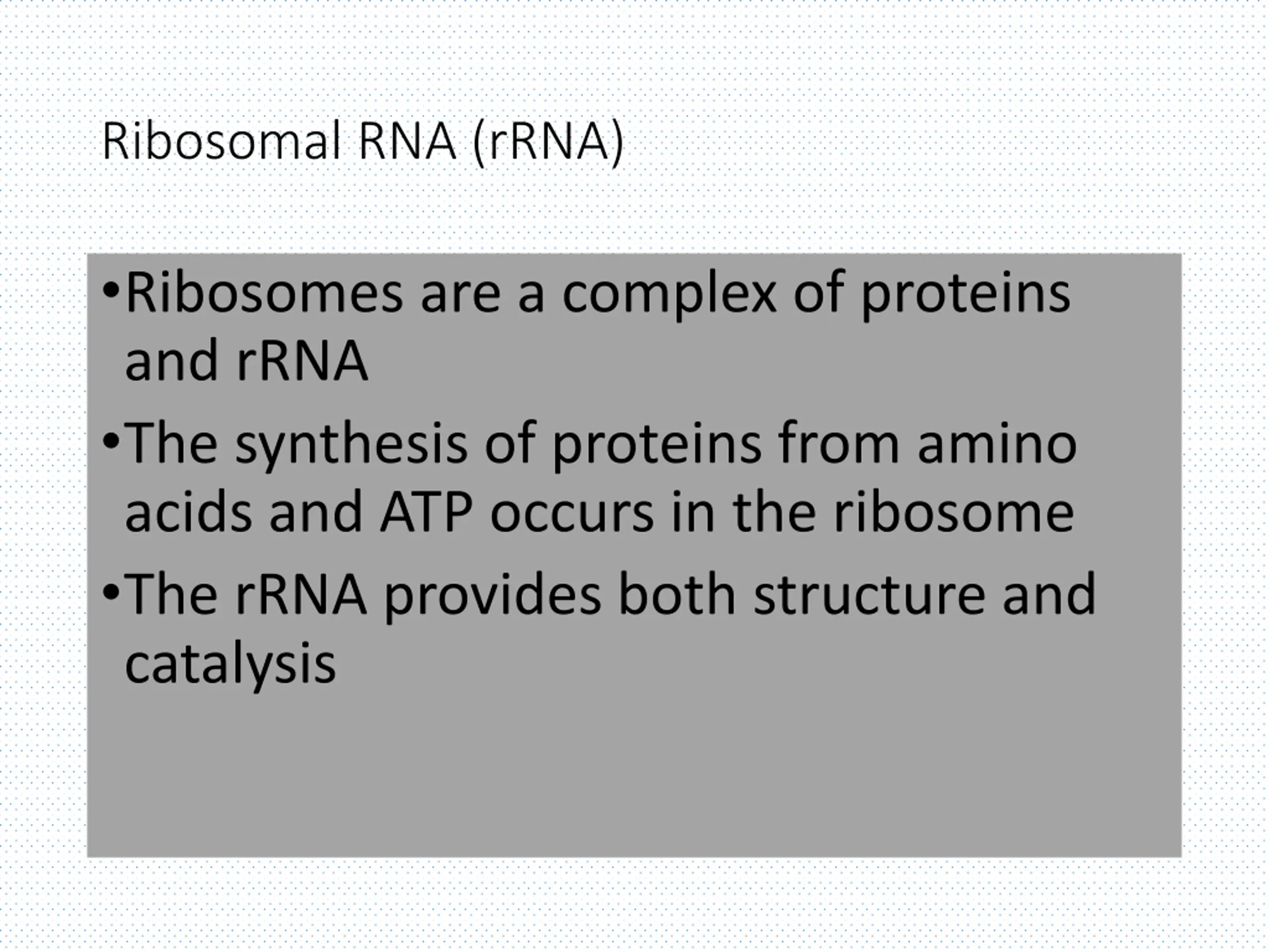 Ribosomal RNA (rRNA) Ribosomes are a complex of proteins and rRNA The synthesis of proteins from amino acids and ATP occurs in the ribosome The rRNA provides both structure and catalysis