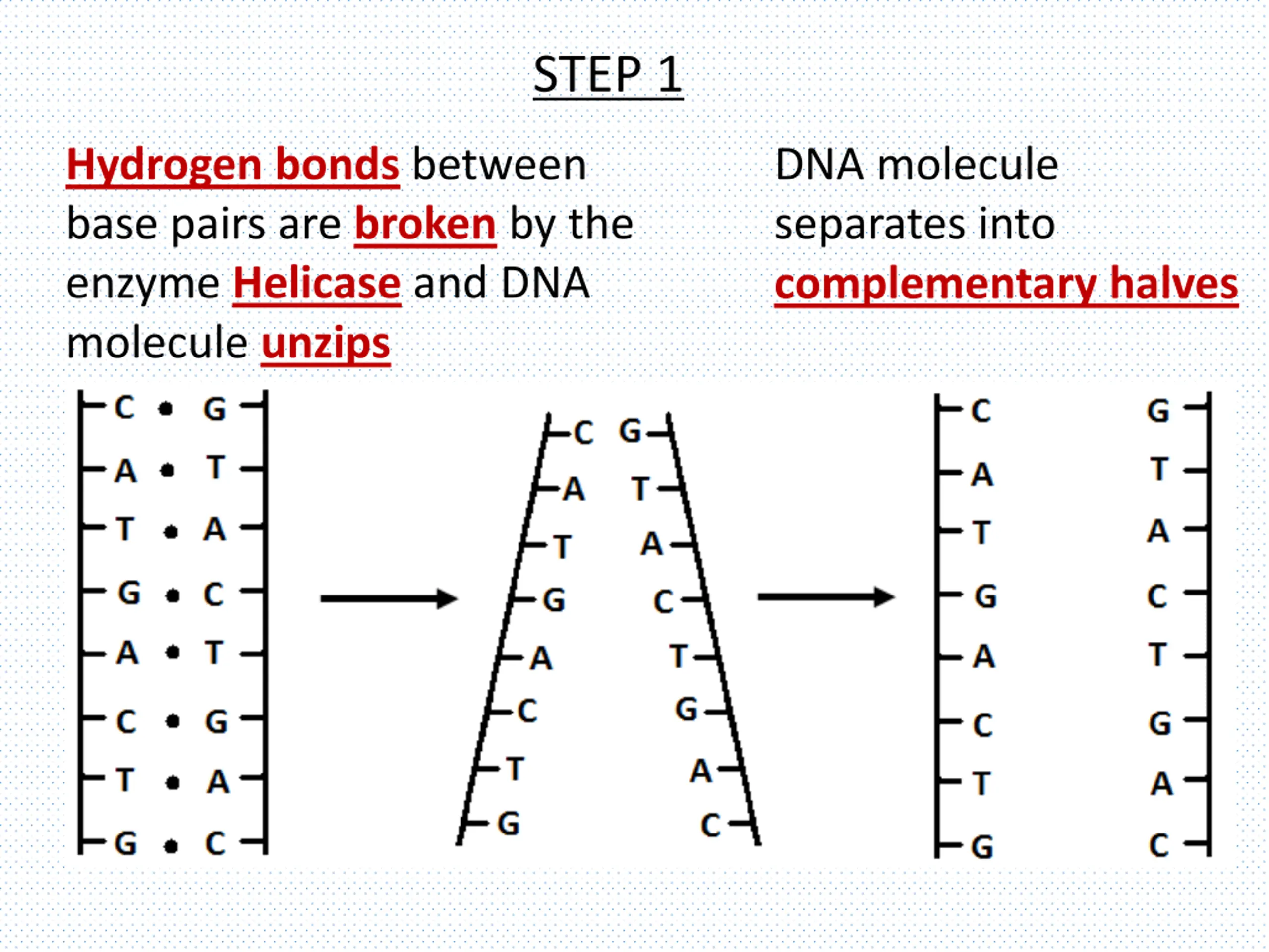 STEP 1 Hydrogen bonds between base pairs are broken by the enzyme Helicase and DNA molecule unzips DNA molecule separates into complementary halves