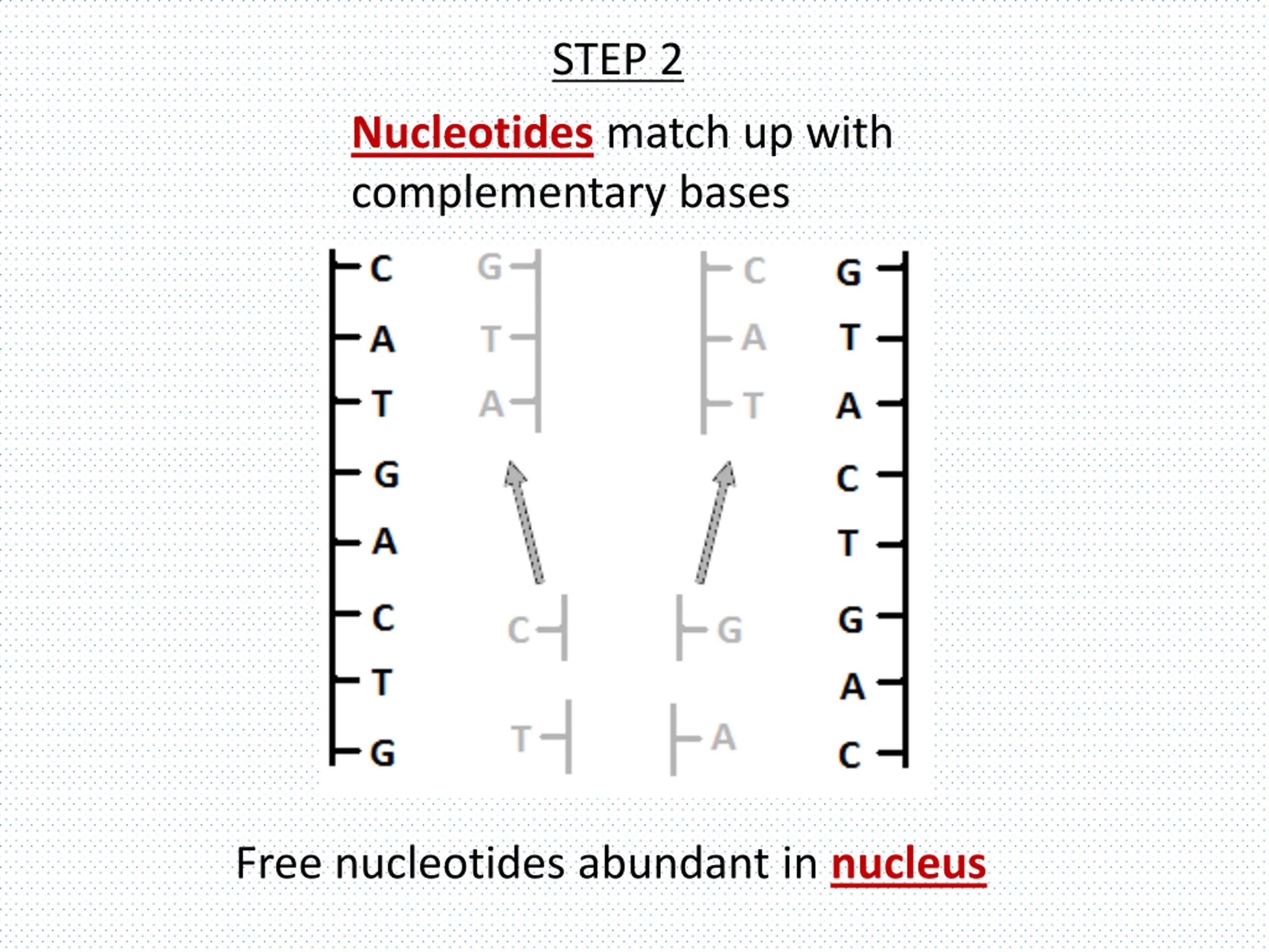 STEP 2 Nucleotides match up with complementary bases Free nucleotides abundant in nucleus