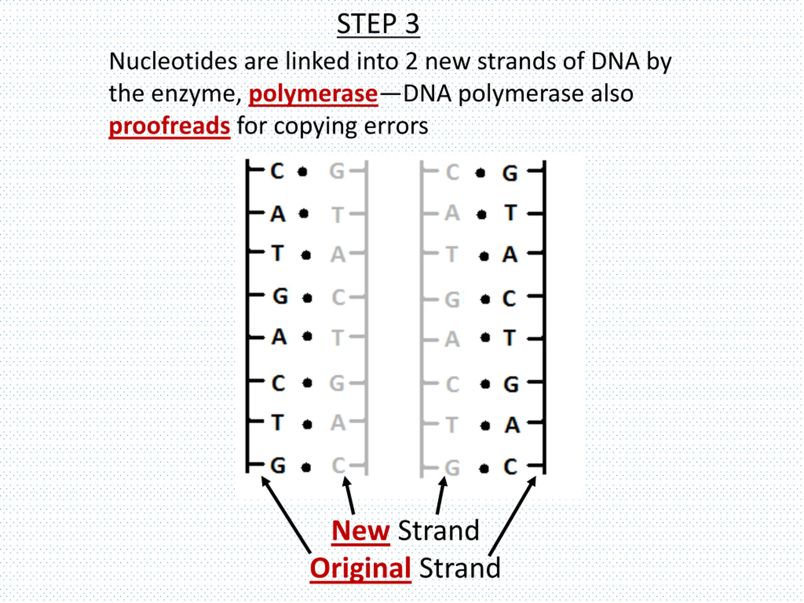 STEP 3 Nucleotides are linked into 2 new strands of DNA by the enzyme, polymerase DNA polymerase also proofreads for copying errors New Strand Original Strand