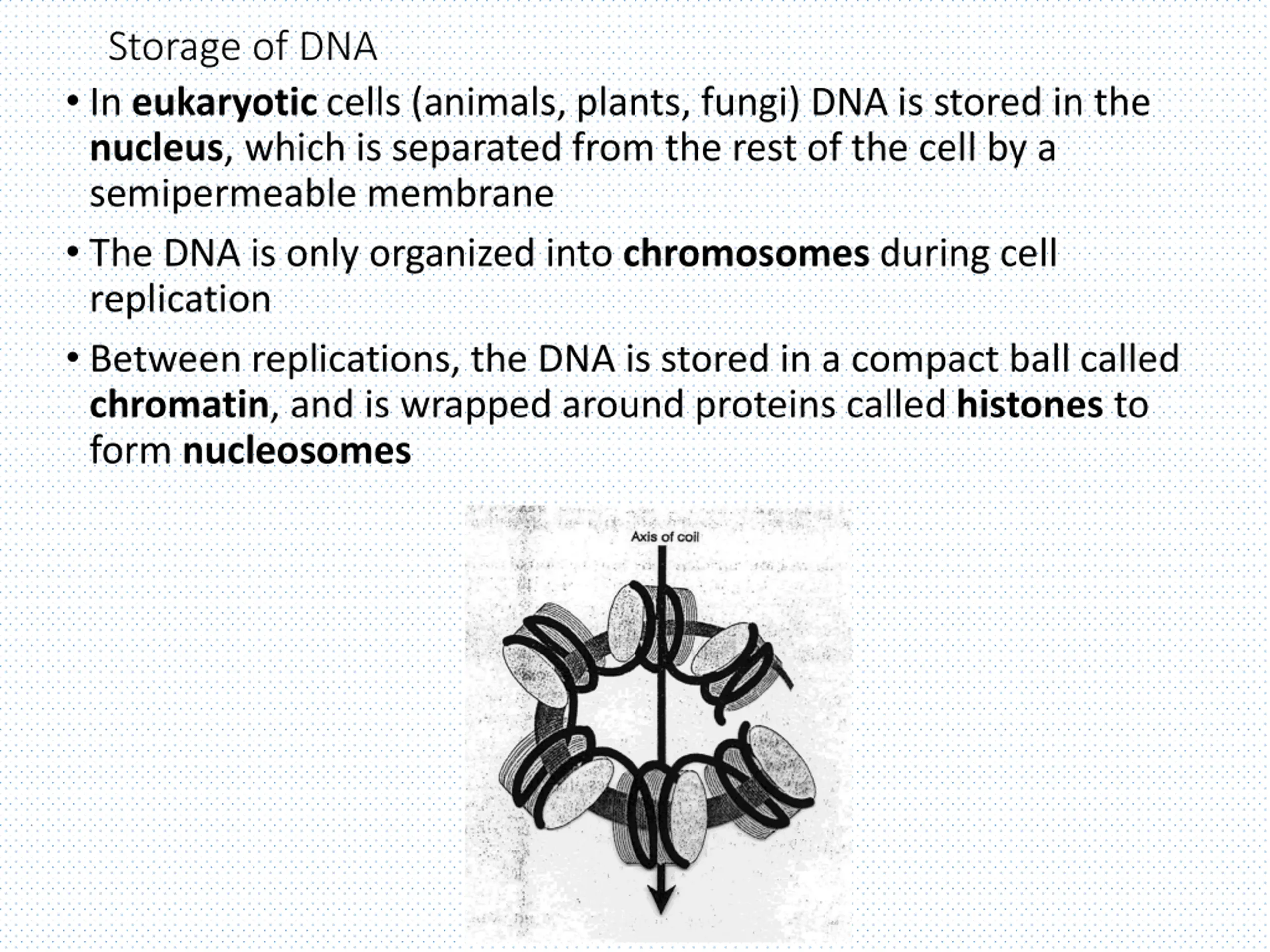 Storage of DNA In eukaryotic cells (animals, plants, fungi) DNA is stored in the nucleus, which is separated from the rest of the cell by a semipermeable membrane The DNA is only organized into chromosomes during cell replication Between replications, the DNA is stored in a compact ball called chromatin, and is wrapped around proteins called histones to form nucleosomes