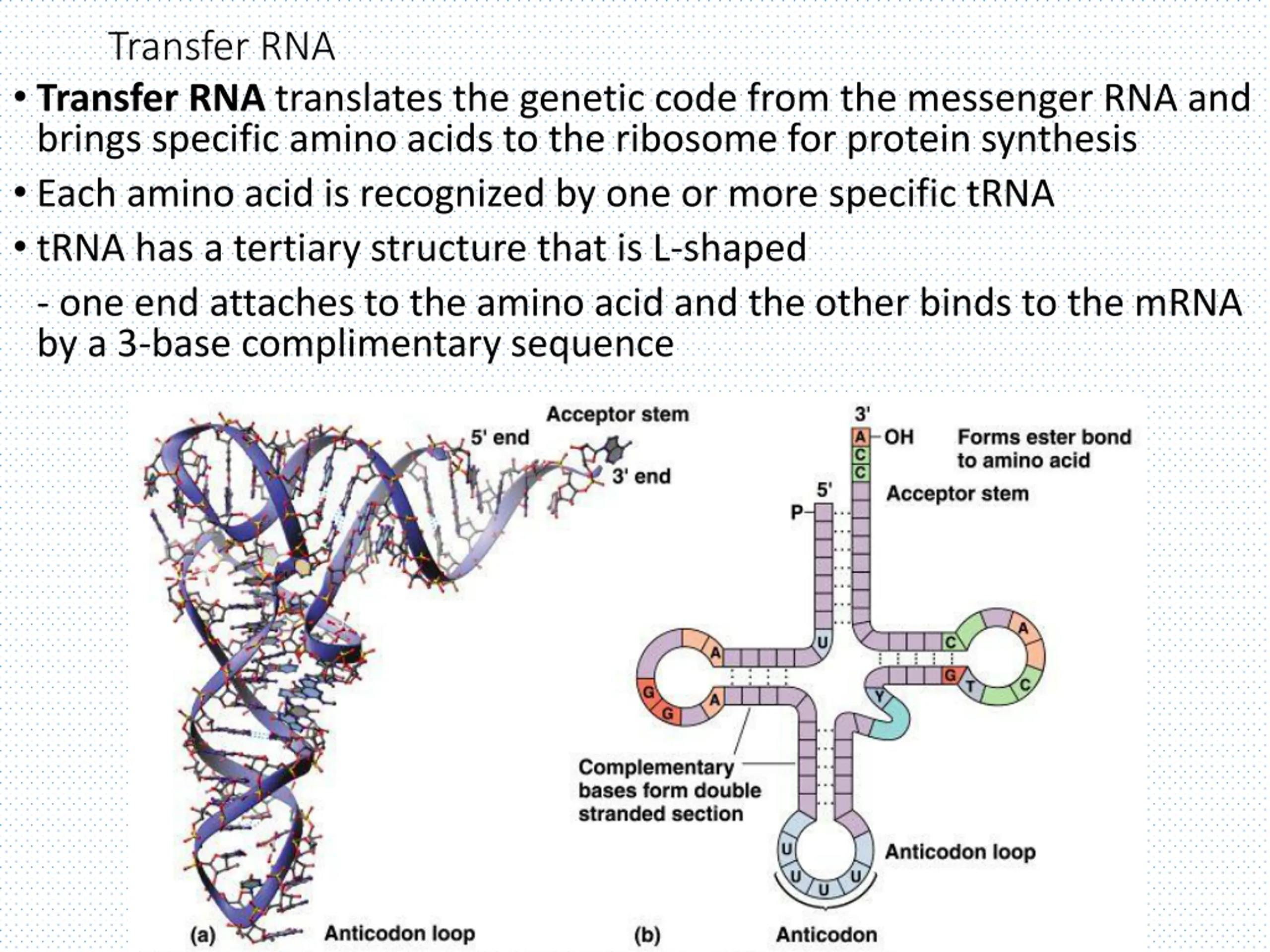 Transfer RNA Transfer RNA translates the genetic code from the messenger RNA and brings specific amino acids to the ribosome for protein synthesis Each amino acid is recognized by one or more specific tRNA tRNA has a tertiary structure that is L-shaped - one end attaches to the amino acid and the other binds to the mRNA by a 3-base complimentary sequence