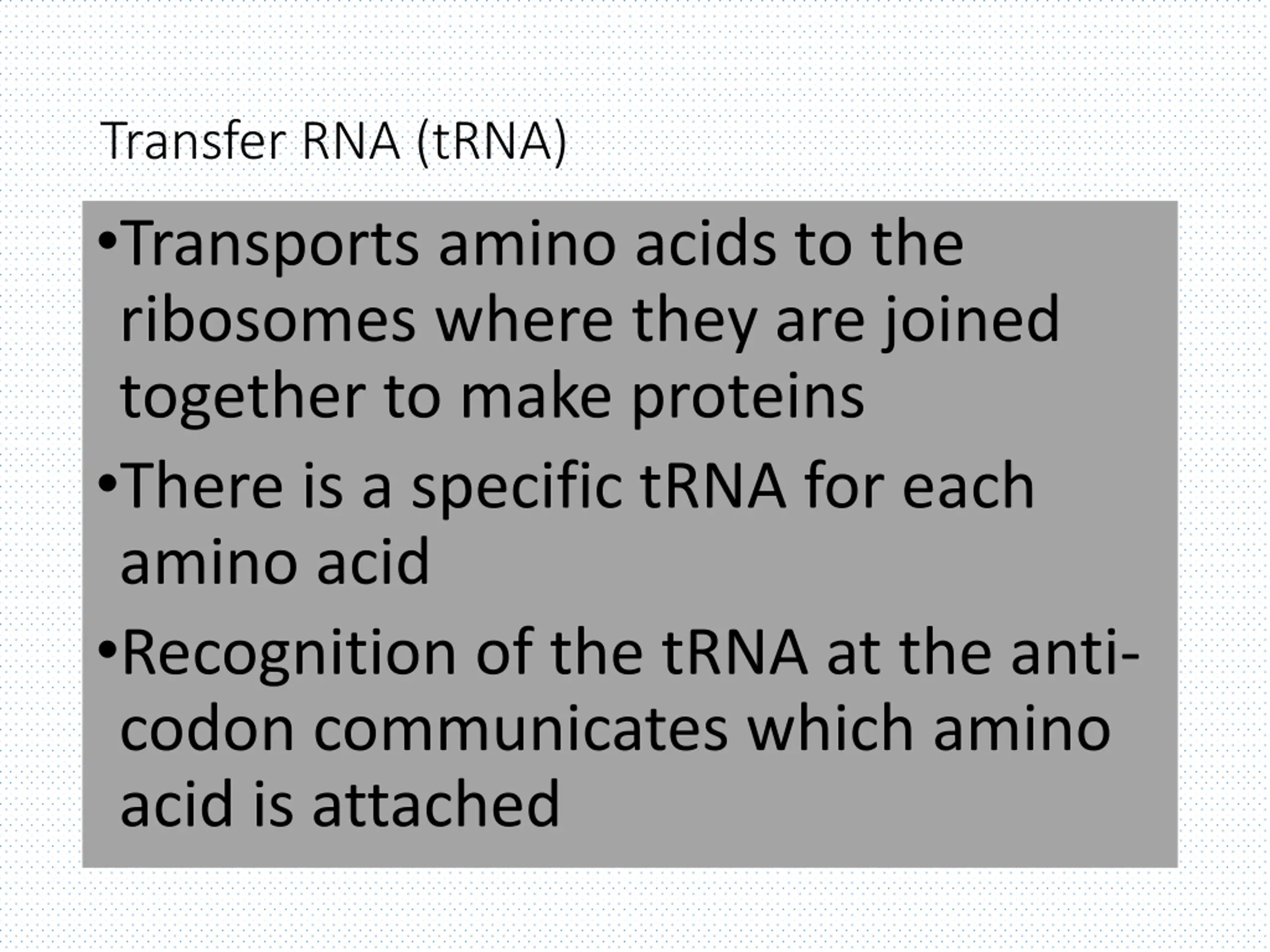 Transfer RNA (tRNA) Transports amino acids to the ribosomes where they are joined together to make proteins There is a specific tRNA for each amino acid Recognition of the tRNA at the anti- codon communicates which amino acid is attached