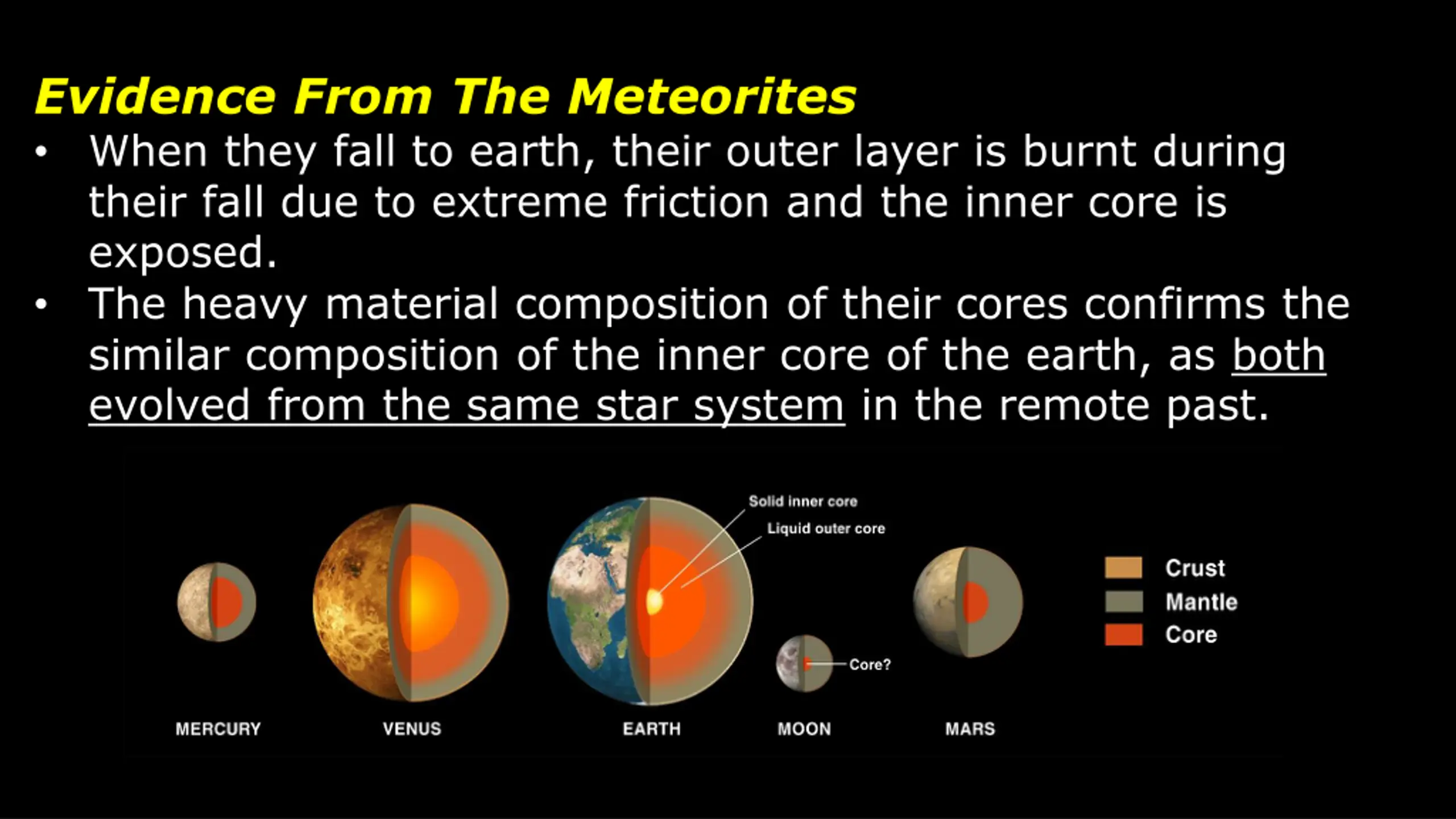 Evidence From The Meteorites When they fall to earth, their outer layer is burnt during their fall due to extreme friction and the inner core is exposed. The heavy material composition of their cores confirms the similar composition of the inner core of the earth, as both evolved from the same star system in the remote past.
