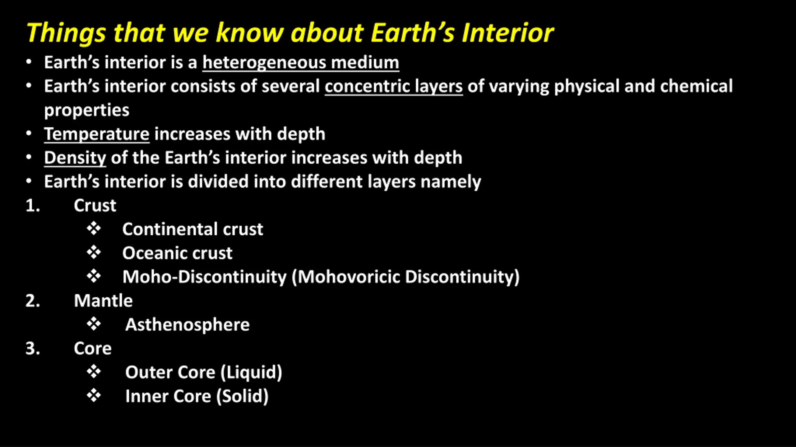 Things that we know about Earths Interior Earth s interior is a heterogeneous medium Earth s interior consists of several concentric layers of varying physical and chemical properties Temperature increases with depth Density of the Earth s interior increases with depth Earth s interior is divided into different layers namely 1. Crust Continental crust Oceanic crust Moho-Discontinuity (Mohovoricic Discontinuity) 2. Mantle Asthenosphere 3. Core Outer Core (Liquid) Inner Core (Solid)