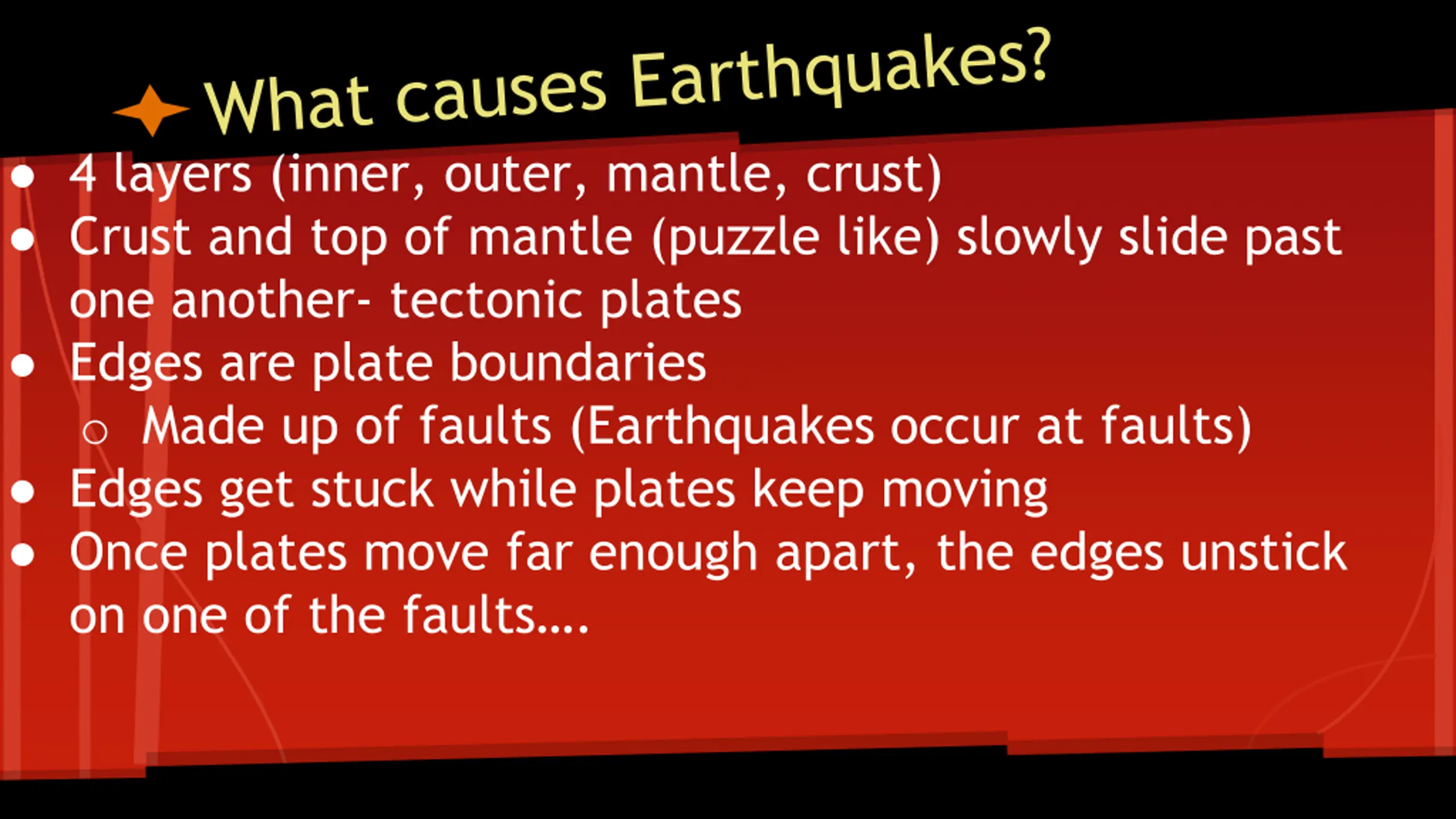4 layers (inner, outer, mantle, crust) Crust and top of mantle (puzzle like) slowly slide past one another- tectonic plates Edges are plate boundaries o Made up of faults (Earthquakes occur at faults) Edges get stuck while plates keep moving Once plates move far enough apart, the edges unstick on one of the faults .
