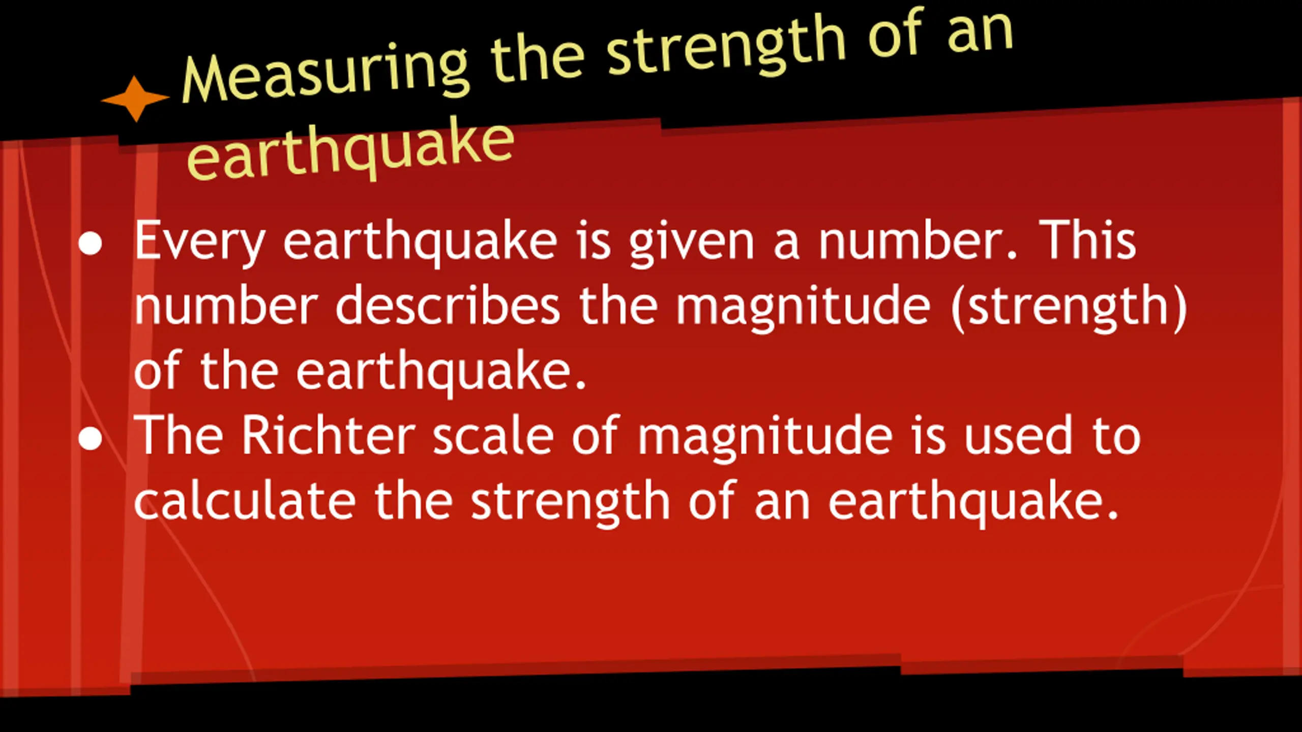 Every earthquake is given a number. This number describes the magnitude (strength) of the earthquake. The Richter scale of magnitude is used to calculate the strength of an earthquake.