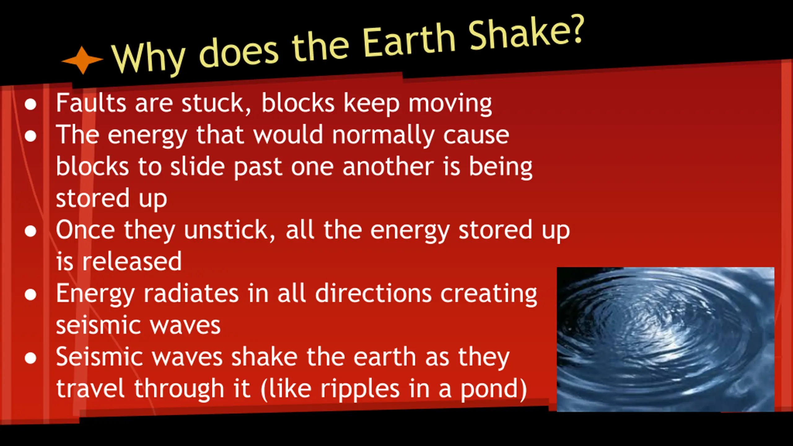 Faults are stuck, blocks keep moving The energy that would normally cause blocks to slide past one another is being stored up Once they unstick, all the energy stored up is released Energy radiates in all directions creating seismic waves Seismic waves shake the earth as they travel through it (like ripples in a pond)