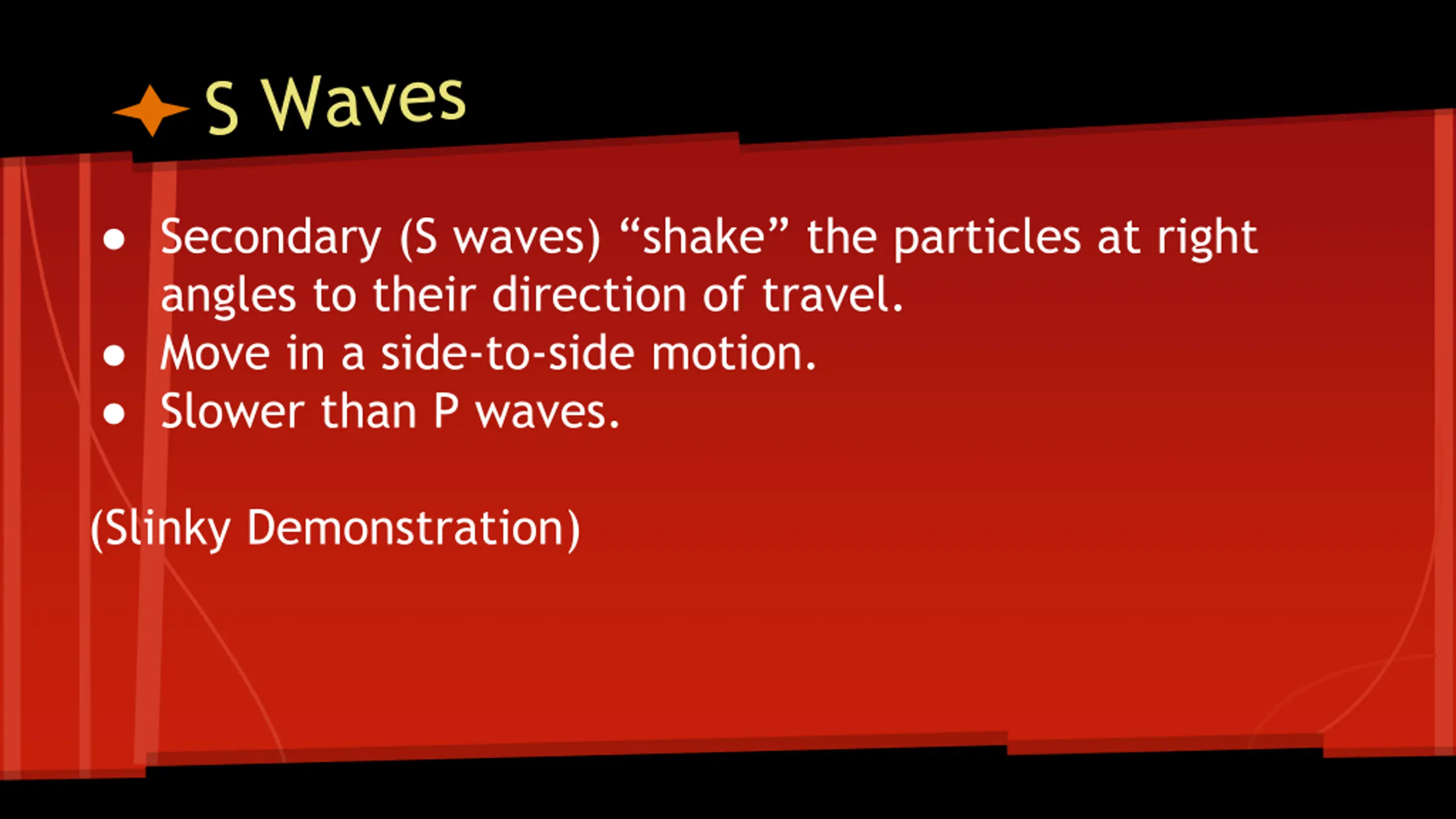 Secondary (S waves) shake the particles at right angles to their direction of travel. Move in a side-to-side motion. Slower than P waves. (Slinky Demonstration)