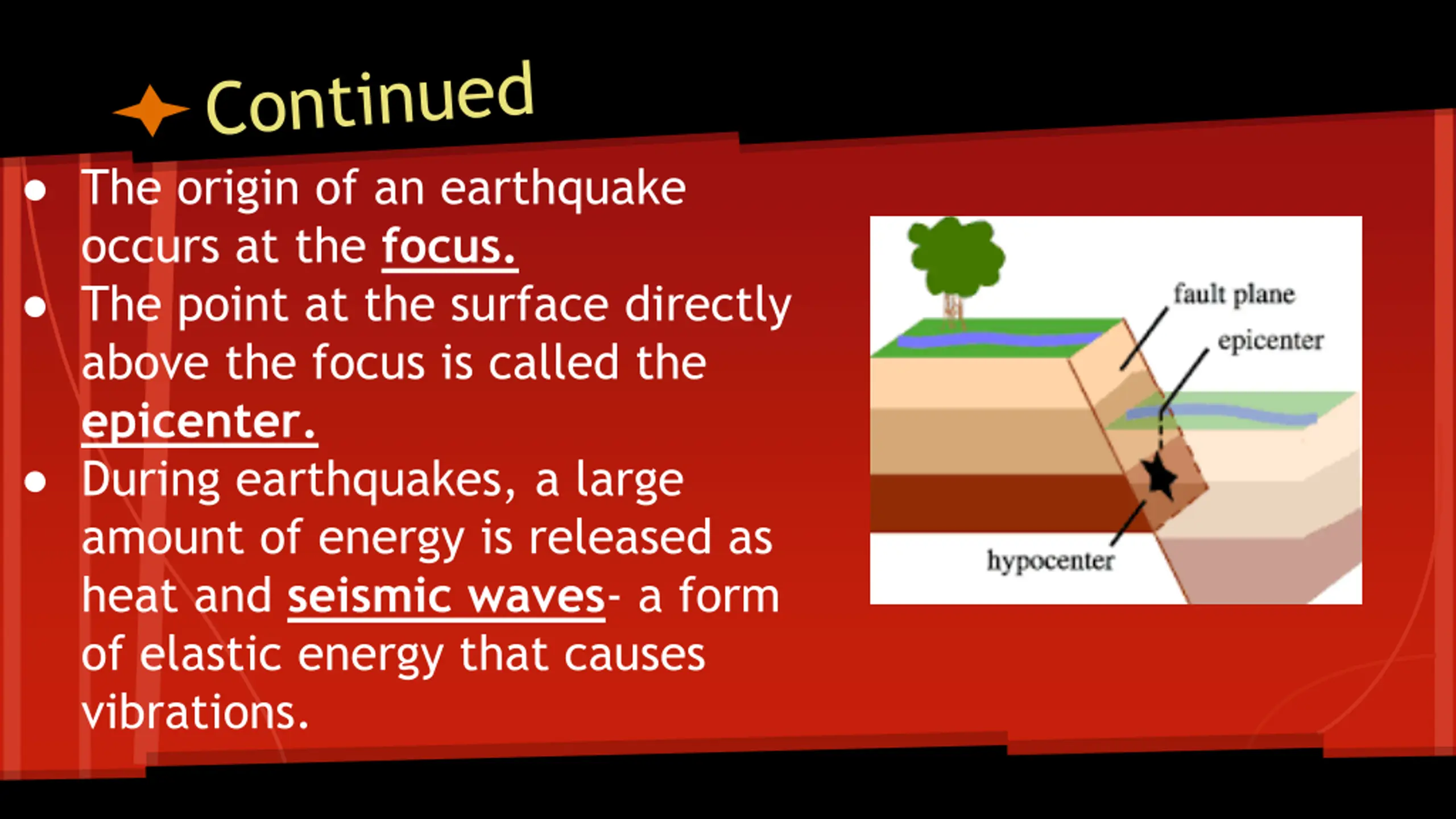 The origin of an earthquake occurs at the focus. The point at the surface directly above the focus is called the epicenter. During earthquakes, a large amount of energy is released as heat and seismic waves- a form of elastic energy that causes vibrations.