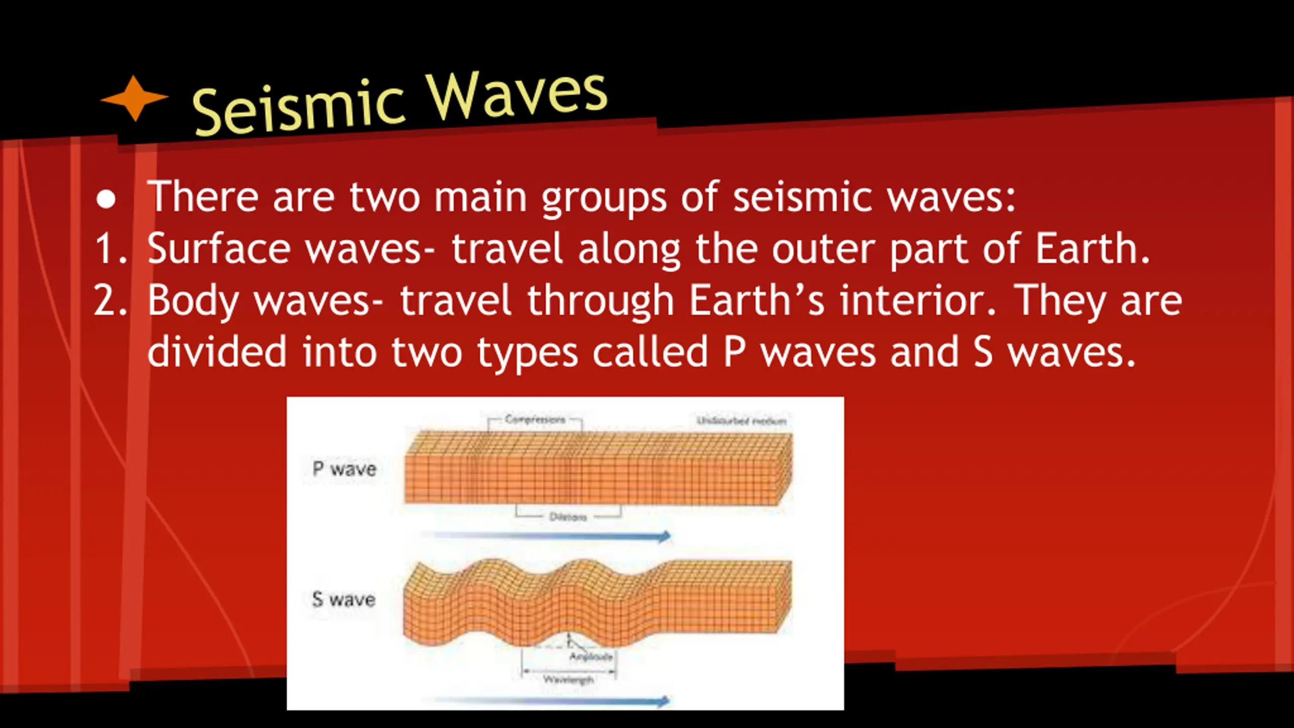 There are two main groups of seismic waves: 1. Surface waves- travel along the outer part of Earth. 2. Body waves- travel through Earth s interior. They are divided into two types called P waves and S waves.