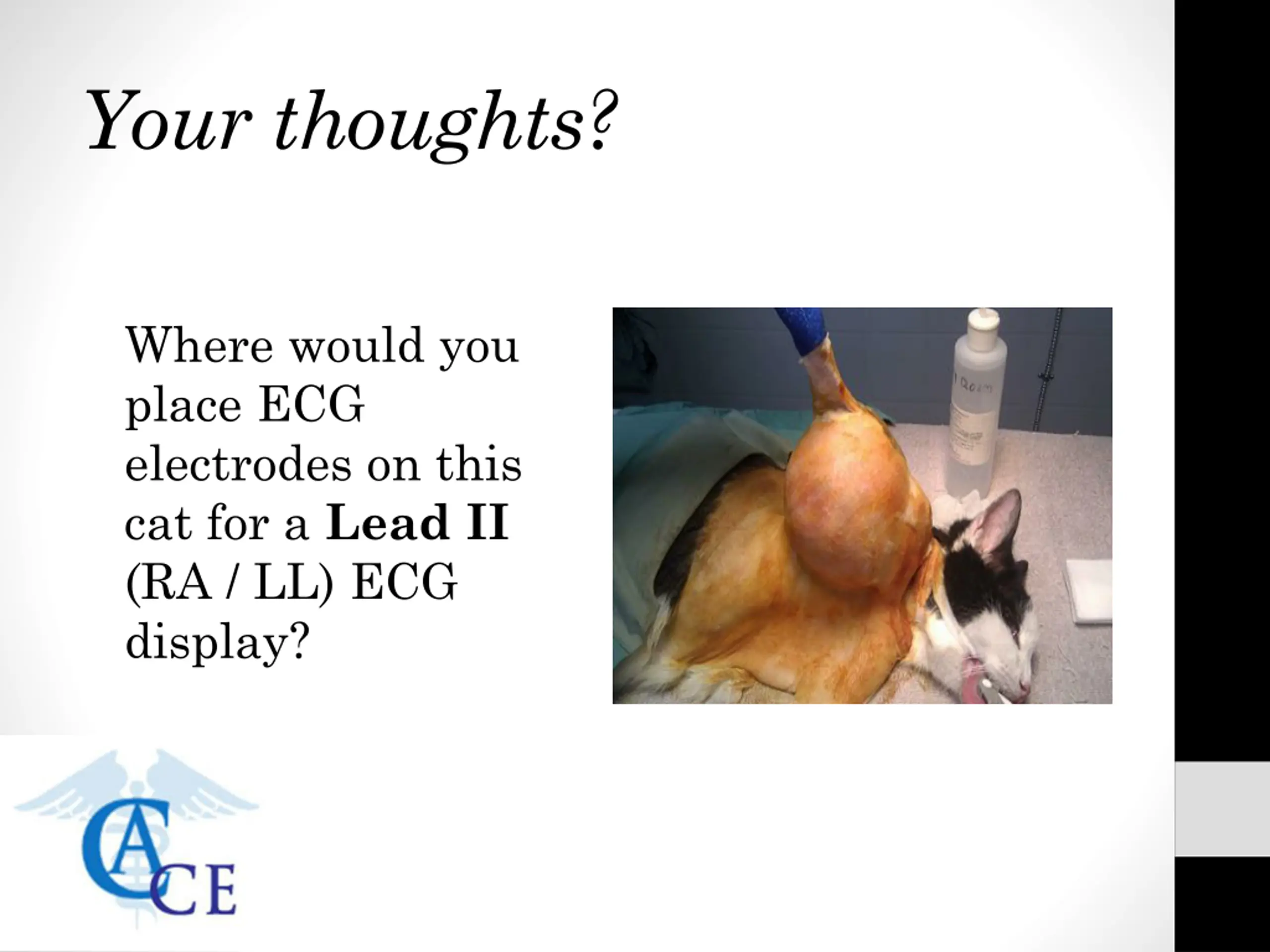 Creative ECG Lead Placement Where would you place ECG electrodes on this cat for a Lead II (RA / LL) ECG display? Note: Avoid the area around the cat s right foreleg because it will be manipulated during surgery producing unreadable motion artifact on your ECG display