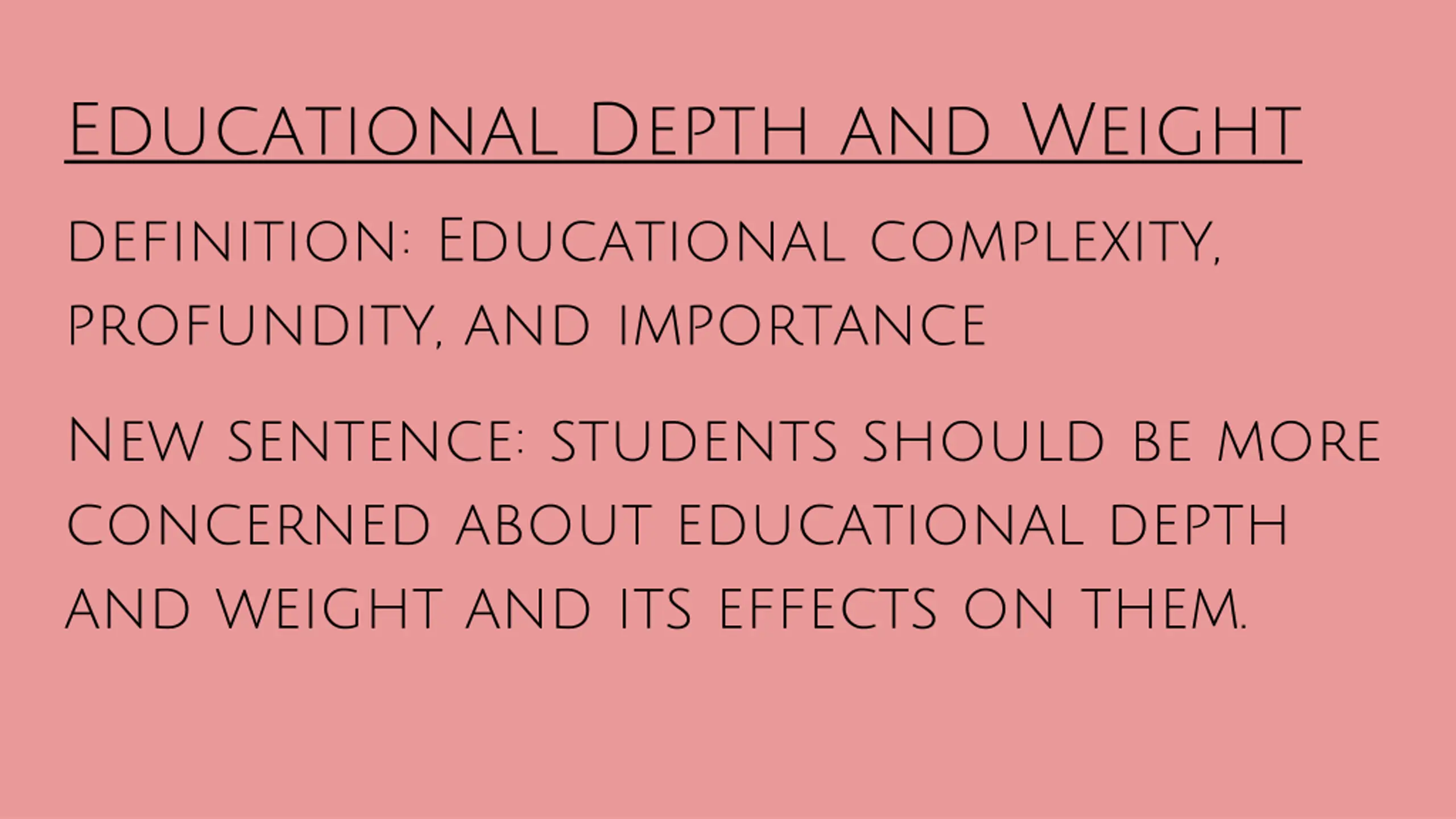 Educational Depth and Weight definition: Educational complexity, profundity, and importance New sentence: students should be more concerned about educational depth and weight and its effects on them.