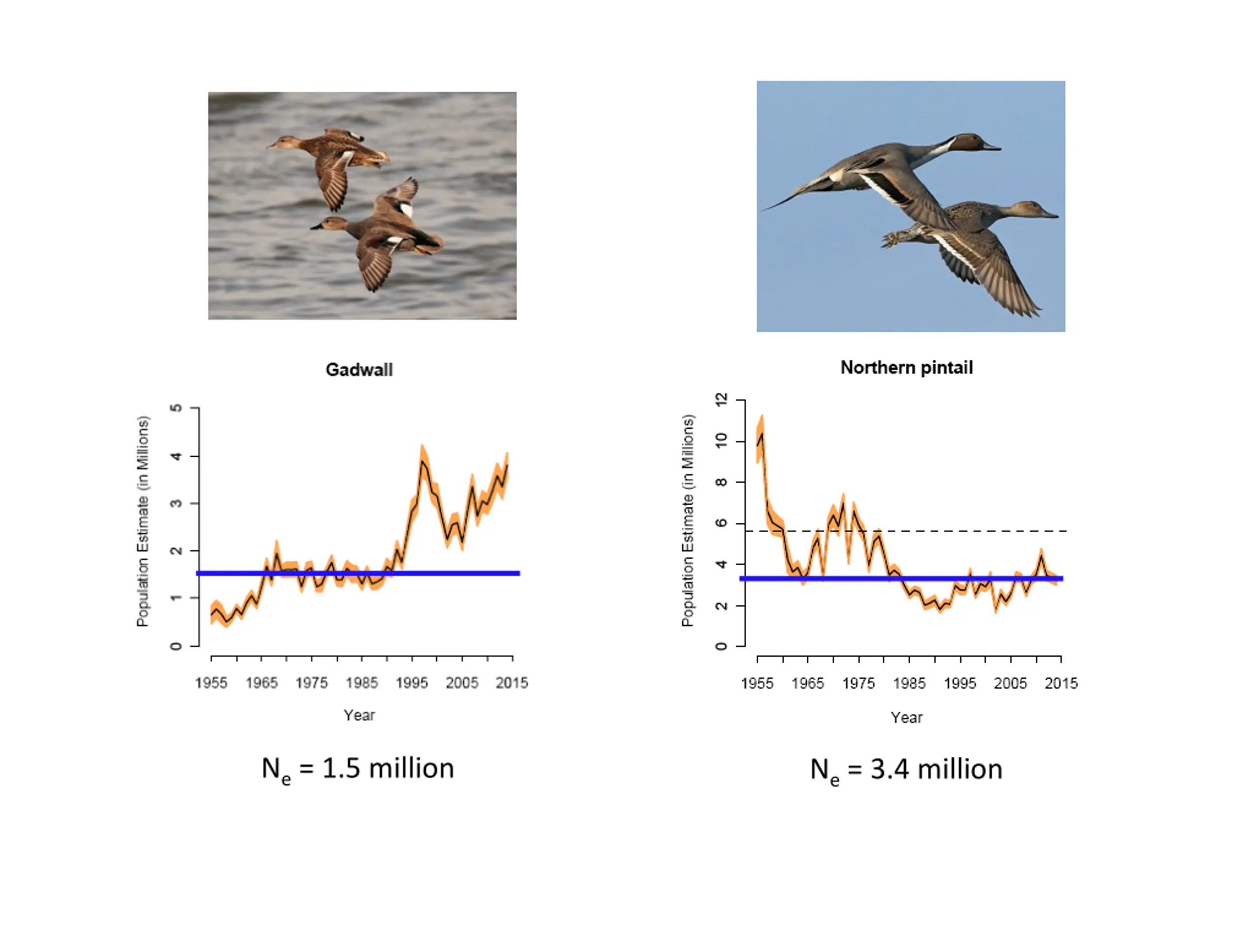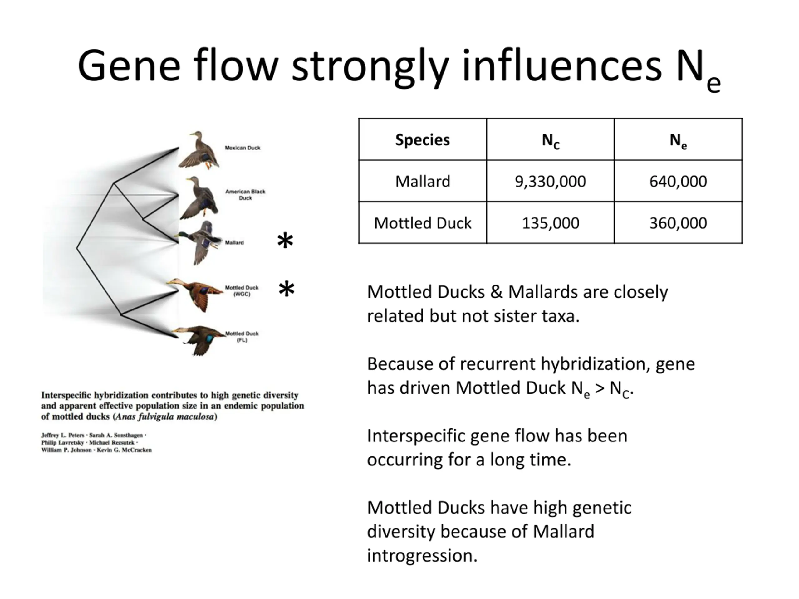 Gene flow strongly influences Ne Species NC Ne Mallard 9,330,000 640,000 Mottled Duck 135,000 360,000 * * Mottled Ducks & Mallards are closely related but not sister taxa. Because of recurrent hybridization, gene has driven Mottled Duck Ne > NC. Interspecific gene flow has been occurring for a long time. Mottled Ducks have high genetic diversity because of Mallard introgression.