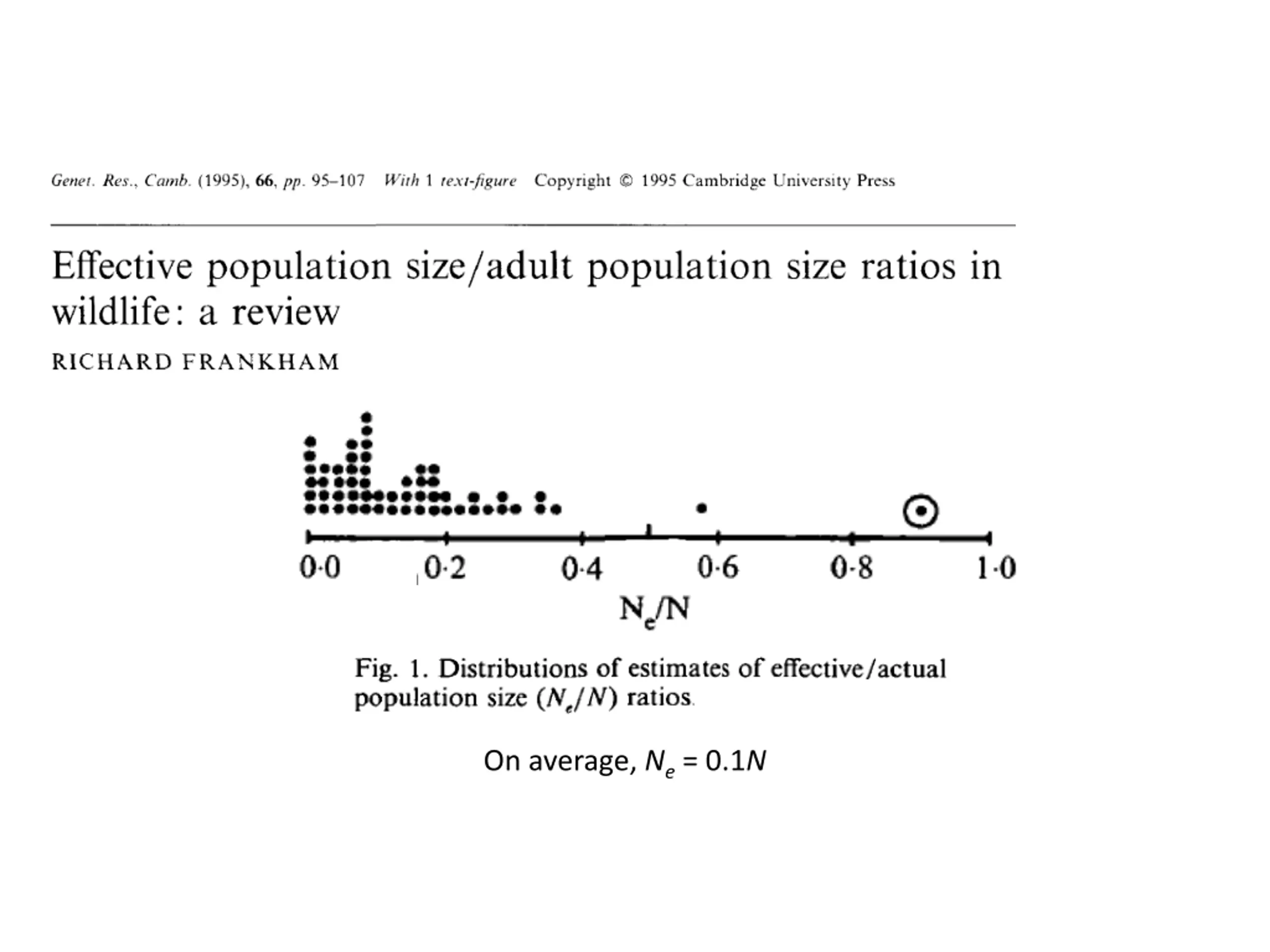 Effective population size (Ne): the size of an idealized population that would experience drift the same as the actual population. So Ne depends on: Sex ratio Breeding structure/overlap of generations Mean and variance of family size Variance in population size over time Etc. Empirical estimates of Ne usually show that changes in allele frequencies due to drift are faster than predicted by N. So Neis almost always < N.