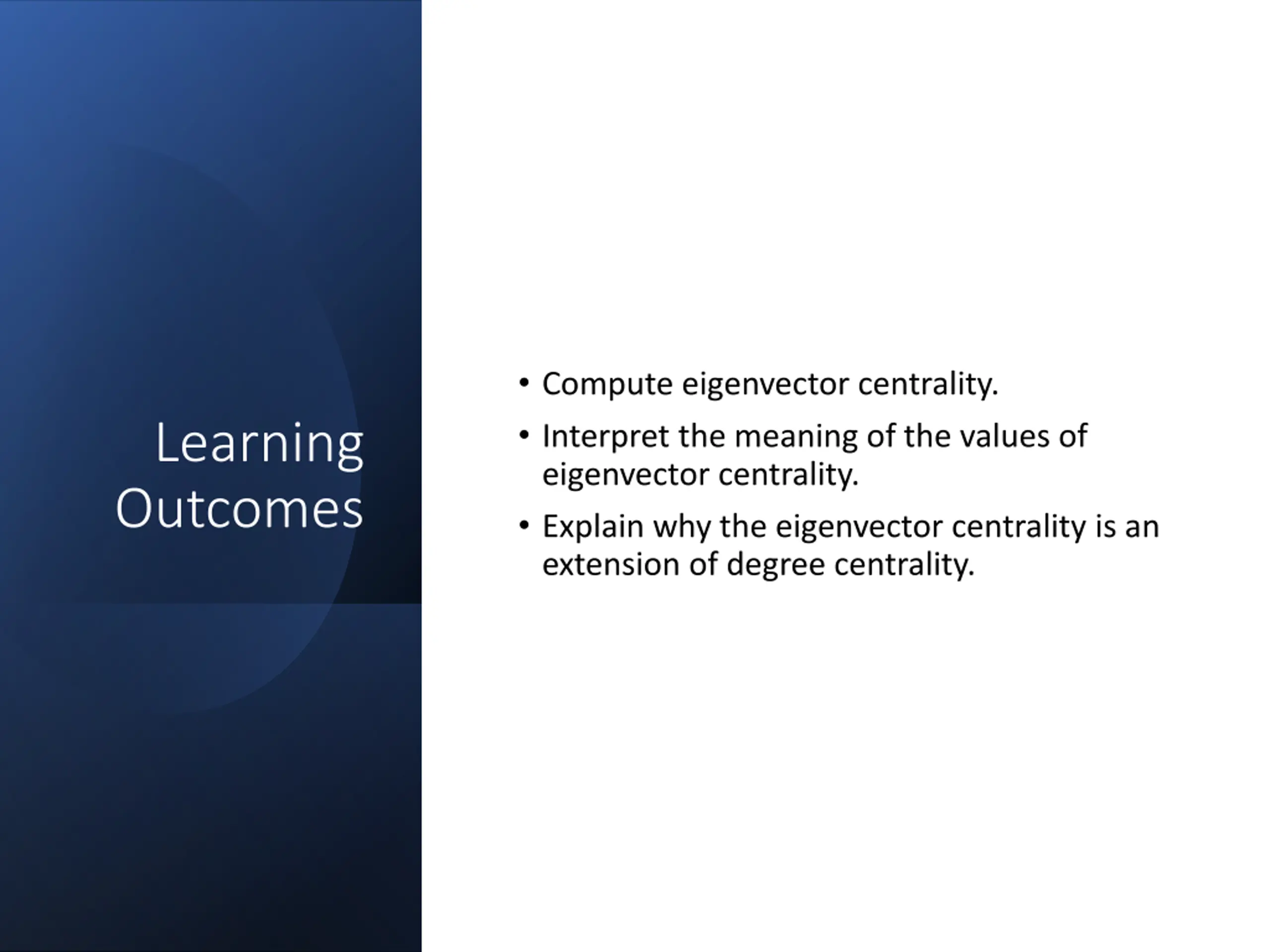 Compute eigenvector centrality. Interpret the meaning of the values of eigenvector centrality. Explain why the eigenvector centrality is an extension of degree centrality. Learning Outcomes
