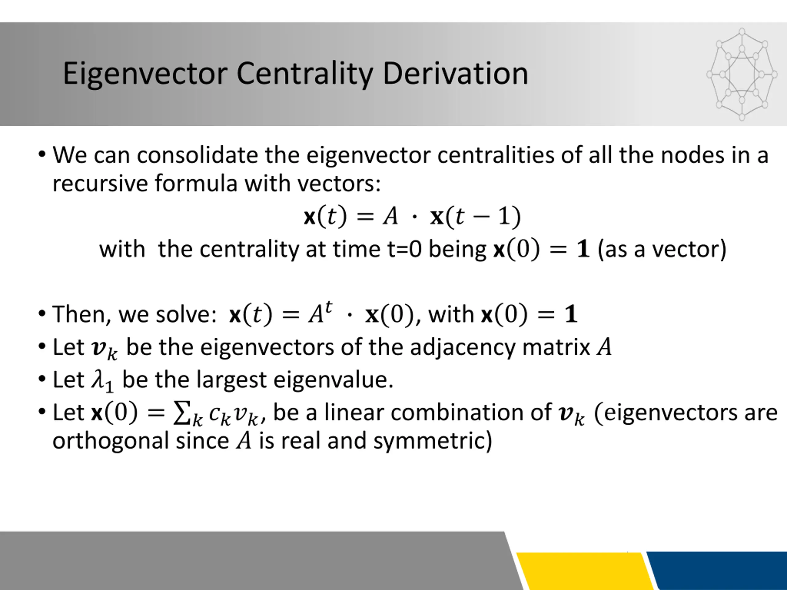 Eigenvector Centrality Derivation We can consolidate the eigenvector centralities of all the nodes in a recursive formula with vectors: x ? = ? ?(? 1) with the centrality at time t=0 being x 0 = ? (as a vector) Then, we solve: x ? = ?? ?(0), with x 0 = ? Let ?? be the eigenvectors of the adjacency matrix ? Let ?1 be the largest eigenvalue. Let x 0 = ?????, be a linear combination of ?? (eigenvectors are orthogonal since ? is real and symmetric)