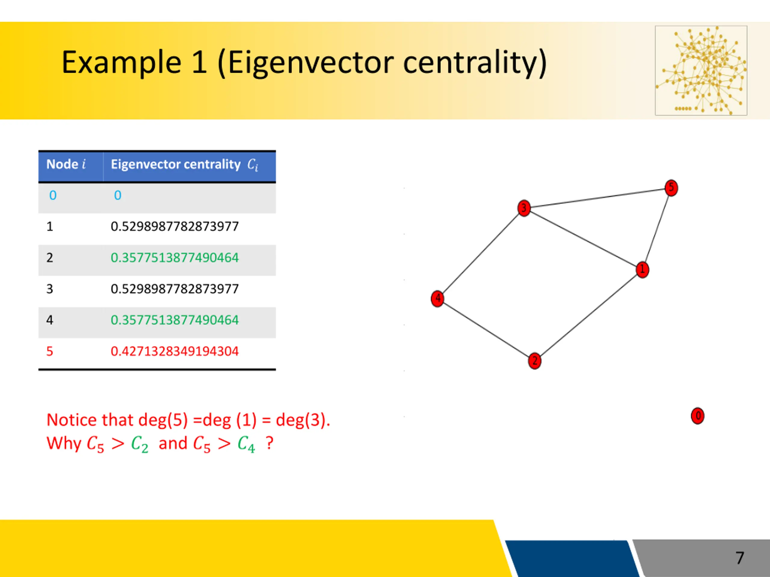 Example 1 (Eigenvector centrality) Node ? Eigenvector centrality ?? 0 0 1 0.5298987782873977 2 0.3577513877490464 3 0.5298987782873977 4 0.3577513877490464 5 0.4271328349194304 Notice that deg(5) =deg (1) = deg(3). Why ?5> ?2and ?5> ?4? 7