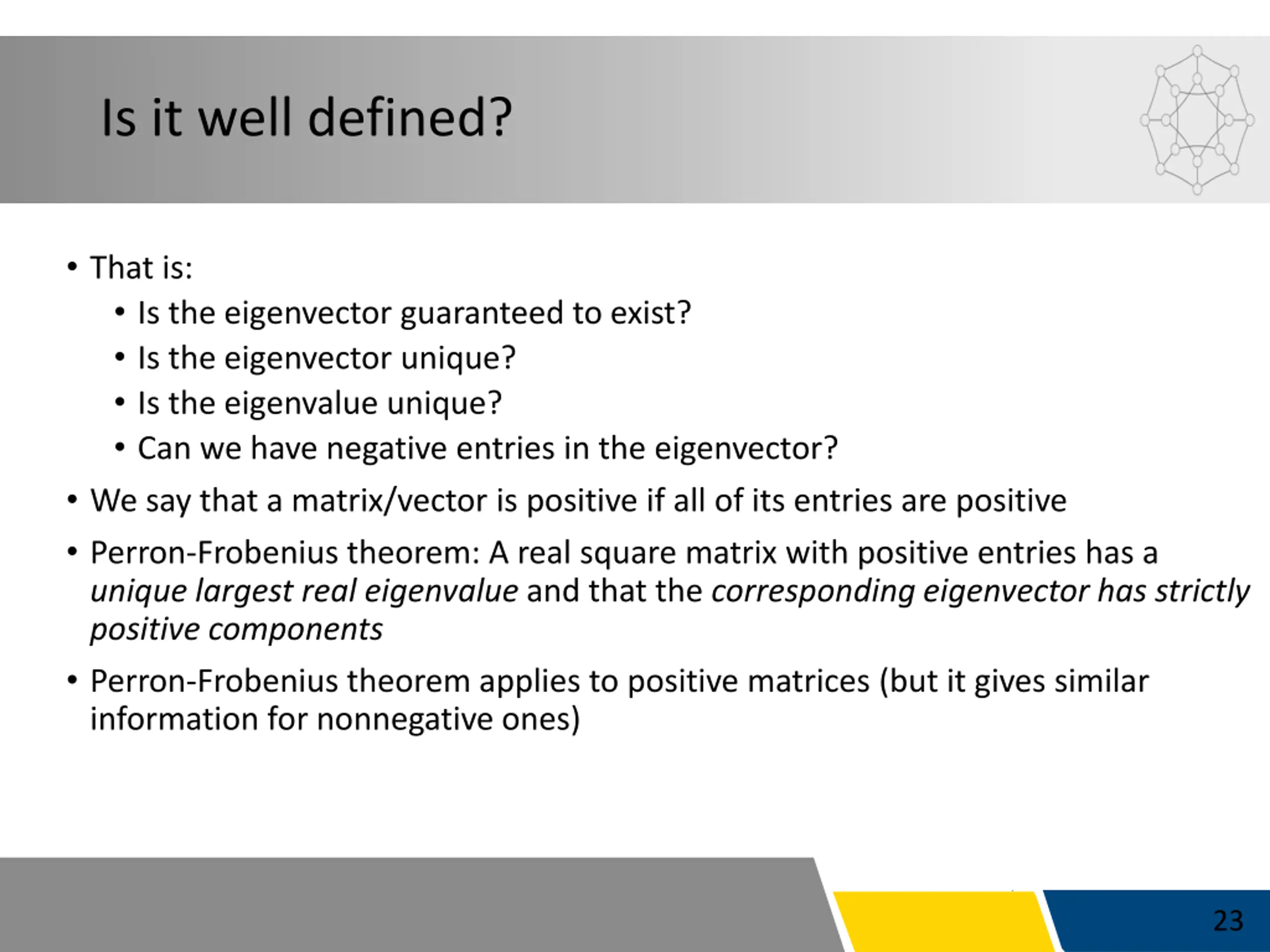Is it well defined? That is: Is the eigenvector guaranteed to exist? Is the eigenvector unique? Is the eigenvalue unique? Can we have negative entries in the eigenvector? We say that a matrix/vector is positive if all of its entries are positive Perron-Frobenius theorem: A real square matrix with positive entries has a unique largest real eigenvalue and that the corresponding eigenvector has strictly positive components Perron-Frobenius theorem applies to positive matrices (but it gives similar information for nonnegative ones) 23