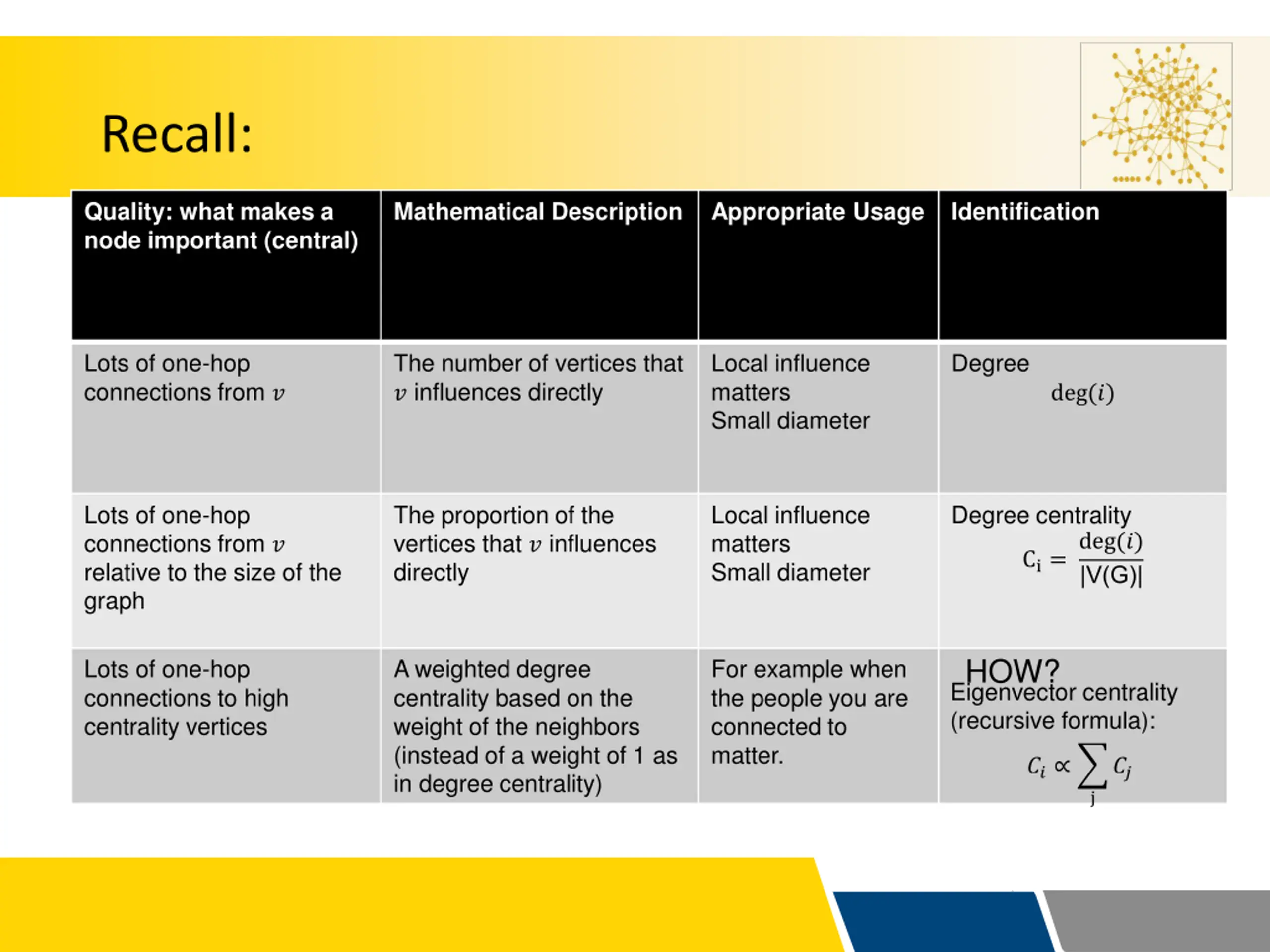 Recall: Quality: what makes a node important (central) Mathematical Description Appropriate Usage Identification Lots of one-hop connections from ? The number of vertices that ? influences directly Local influence matters Small diameter Degree deg(?) Lots of one-hop connections from ? relative to the size of the graph The proportion of the vertices that ? influences directly Local influence matters Small diameter Degree centrality deg(?) |V(G)| Ci= HOW? Eigenvector centrality (recursive formula): Lots of one-hop connections to high centrality vertices A weighted degree centrality based on the weight of the neighbors (instead of a weight of 1 as in degree centrality) For example when the people you are connected to matter. ?? ?? j